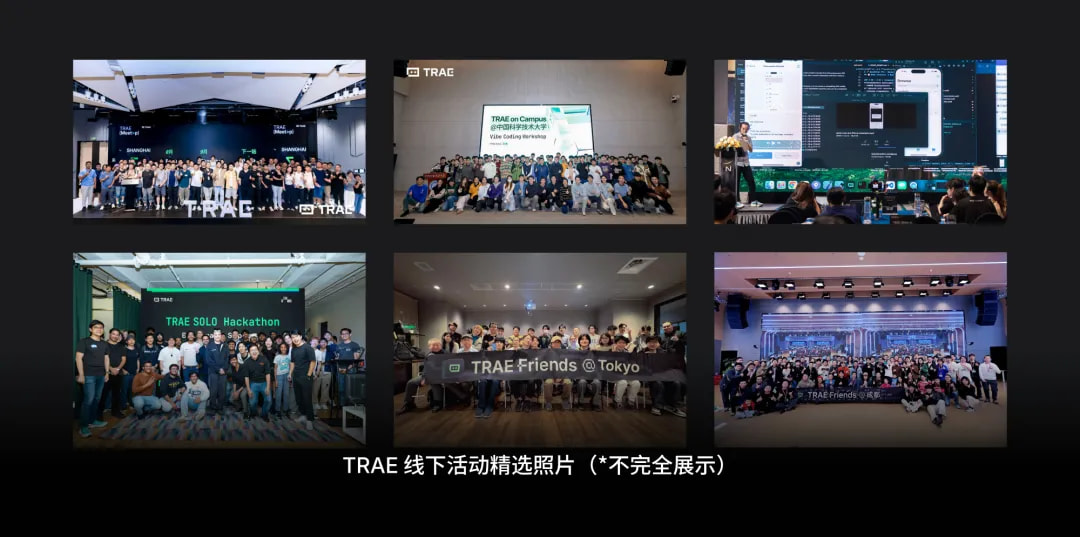 2025 年,TRAE 的足迹遍布全球 60+ 个城市,通过共 130+ 场官方黑客松、Meetup 以及 TRAE Friends、TRAE on Campus 等活动,与 2 万余名开发者线下相聚。