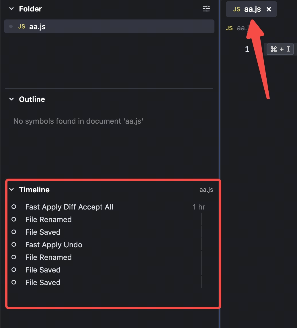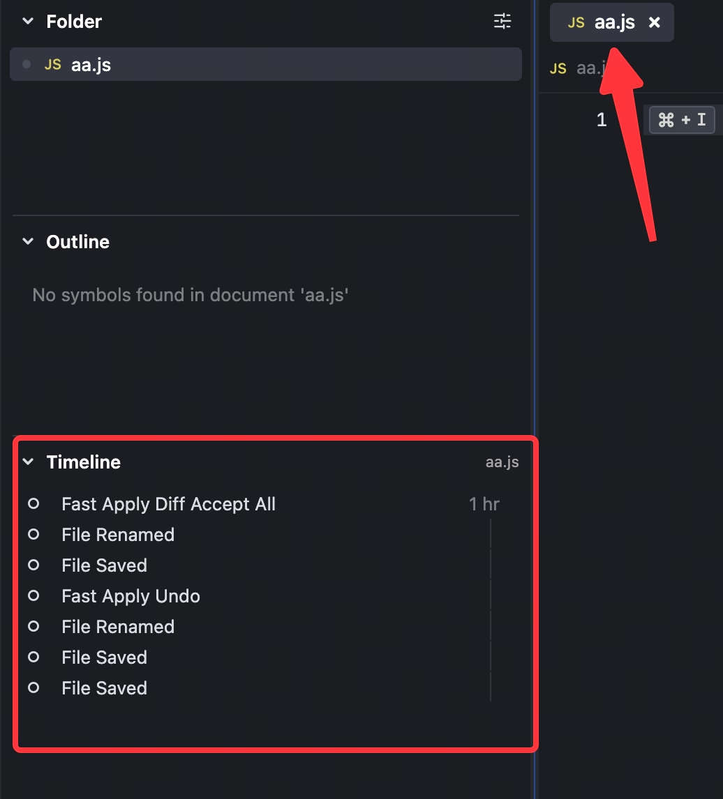 |2|文件树下方位置,打开 Timeline 面板,就会看到此文件操作历史|||