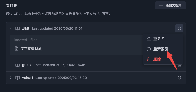 请问上下文设置中的文档集功能是否会随着文档内容的改变同步更新?