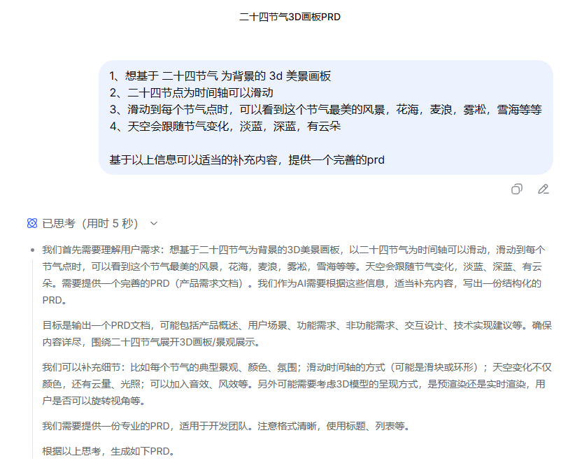 1、先用一句话设计prd,这句话主要是你想要做的内容,这一步我倾向于用deepseek,一个是可以完善,可以提更具体的要求,主要是能留存记录