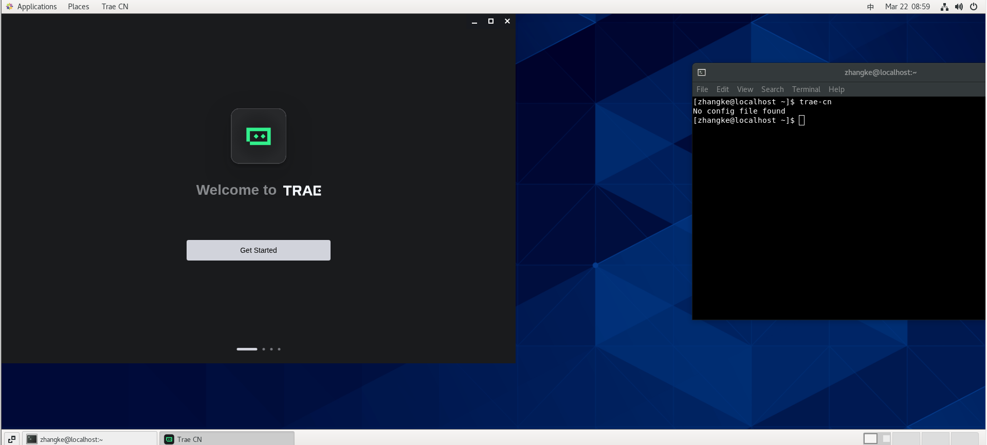如图,我在centos 8中,下载的是 .rpm(X64)安装包,安装之后如图右边的命令行中,这样运行trae-cn,能正常出现 Get Started 界面,但是几秒钟之后,就消失了。尝试重启系统、反复执行trae-cn都是这样。请问我该怎么办?