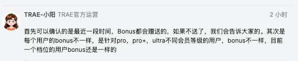 阳哥说: 首先可以确认的是最近一段时间,Bonus都会赠送的,如果不送了,我们会告诉大家的。其次是每个用户的bonus不一样,是针对pro,pro+,ultra不同会员等级的用户,bonus不一样,目前一个档位的用户bonus还是一样的 原文: