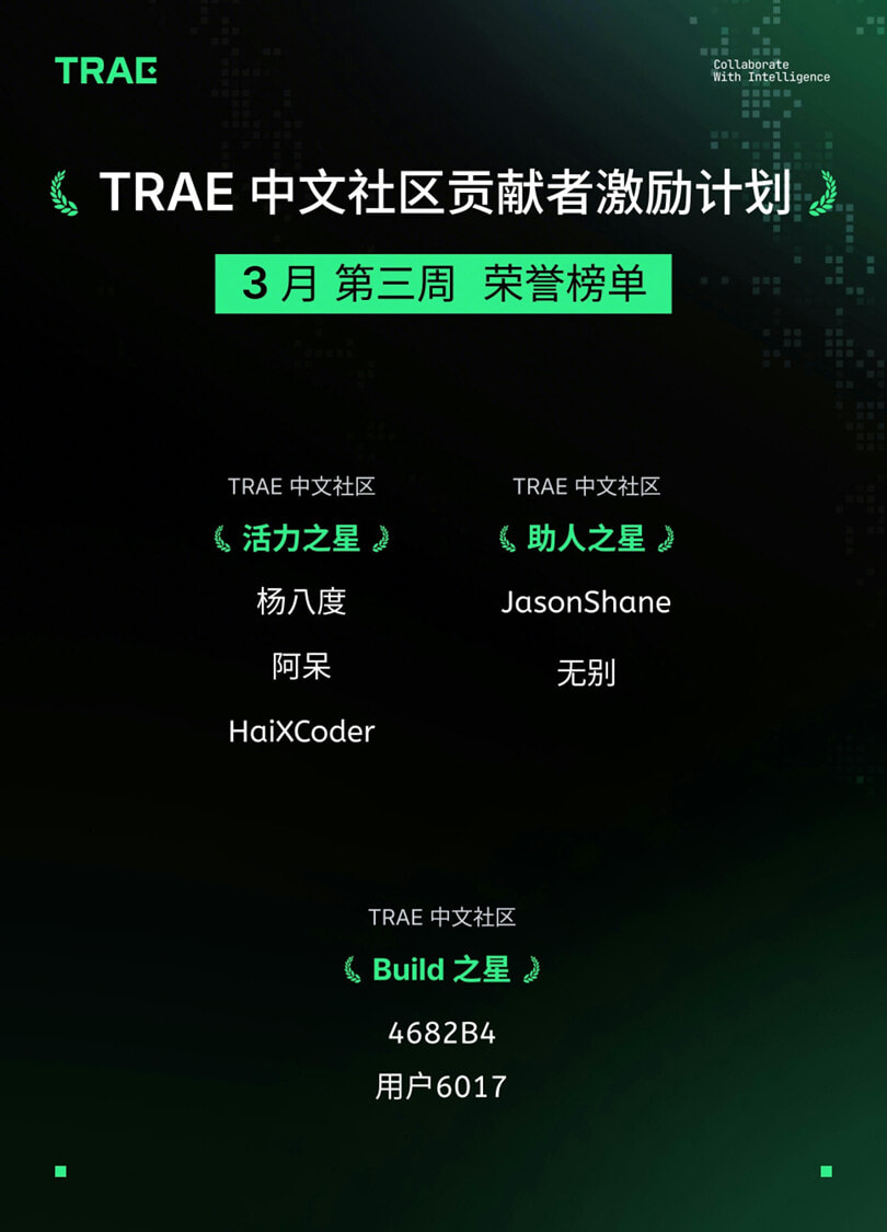 了解贡献者激励计划详情: 🎉 TRAE 社区贡献者每周评选开启!分享、互动、助人赢好礼