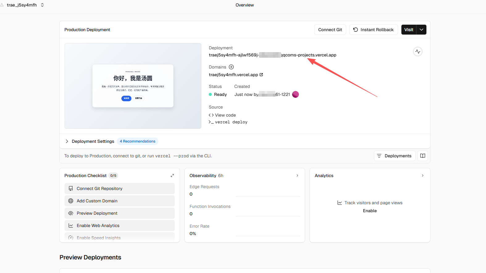 部署完成后,Vercel 会自动生成一个免费域名,格式: