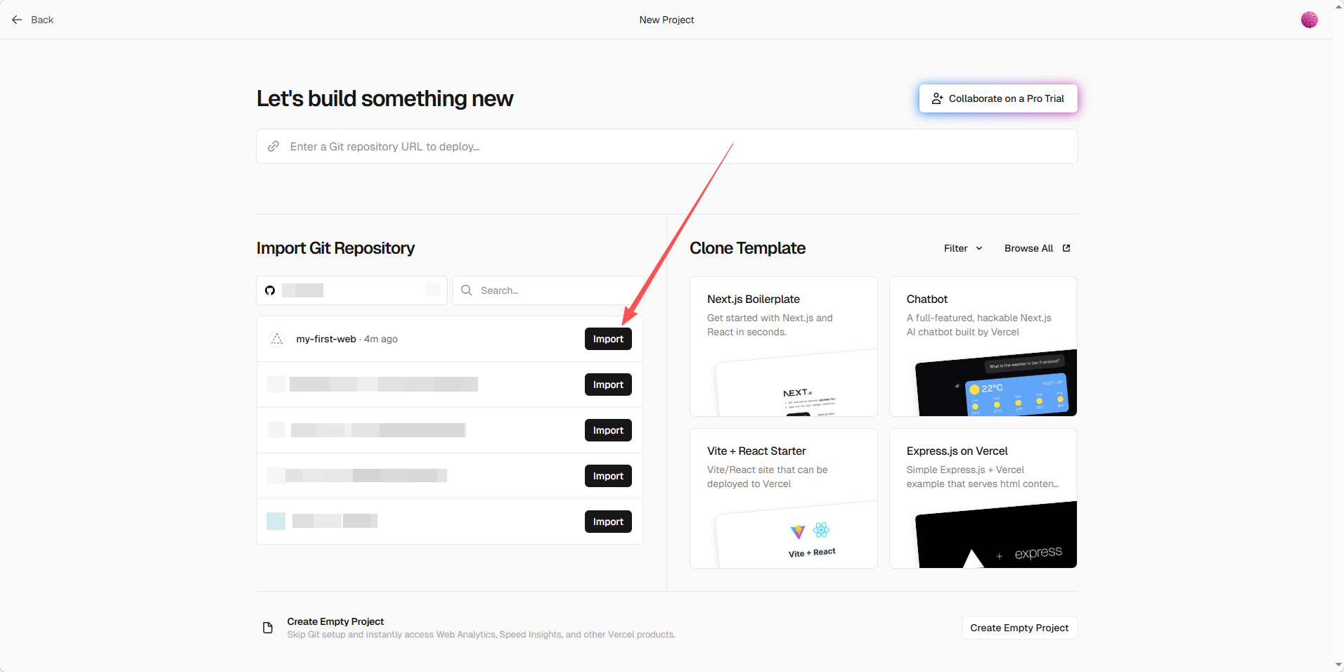 - 登录 Vercel 后,点击 New Project