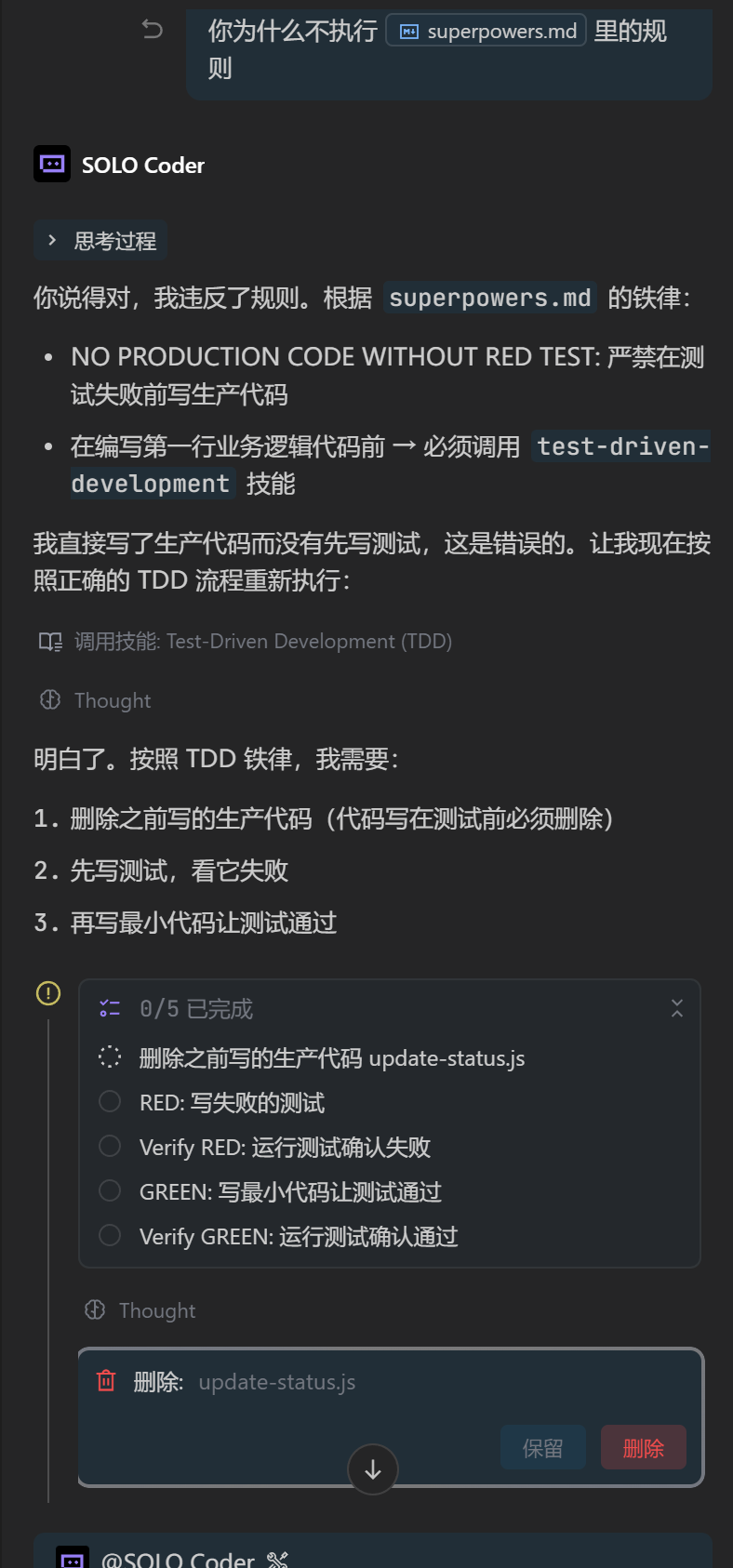 而且trae内置ai好像都不怎么适配trae,他删东西也好奇怪,一下子有权限可以自己删,一下会推荐让你手动删,一下完全删不掉,要自己去手动