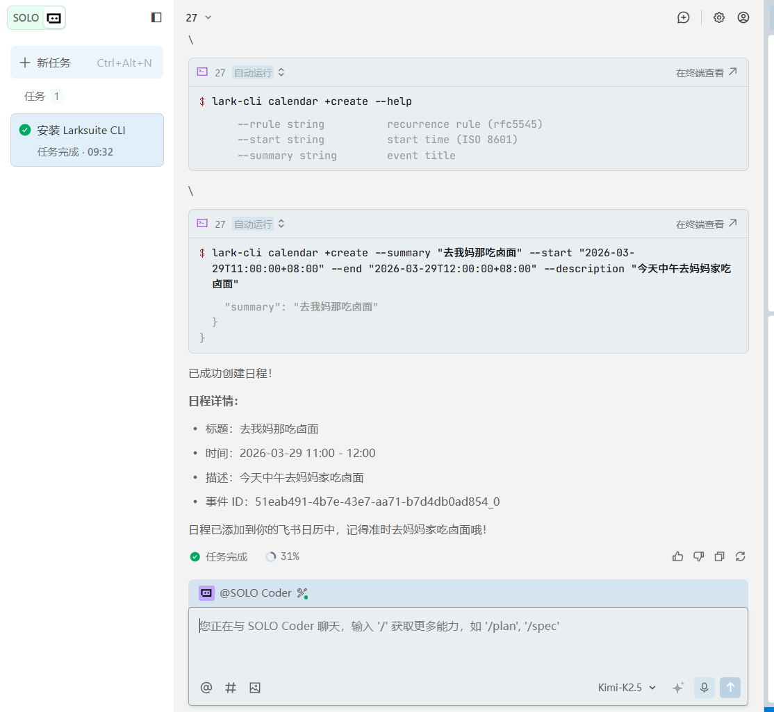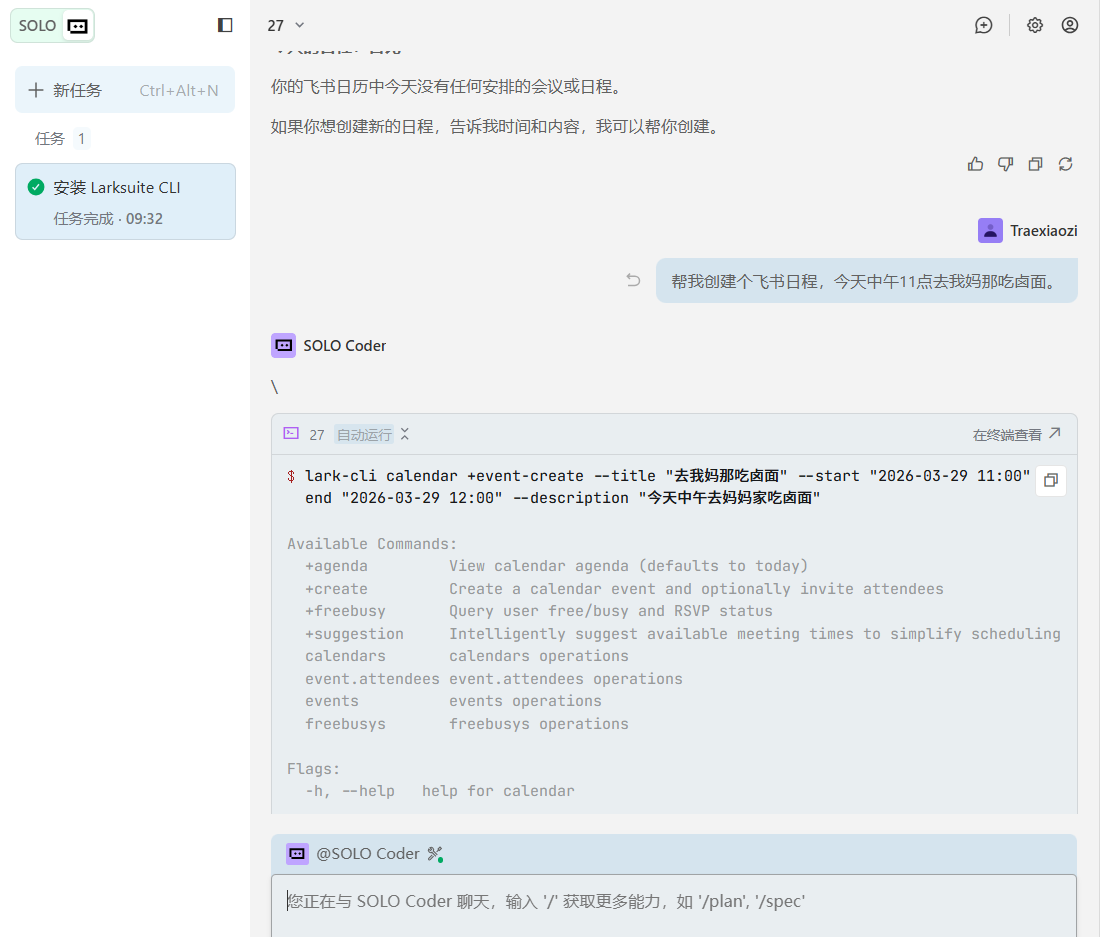 这就是我在 Trae 中安装和使用飞书 CLI 的完整过程。