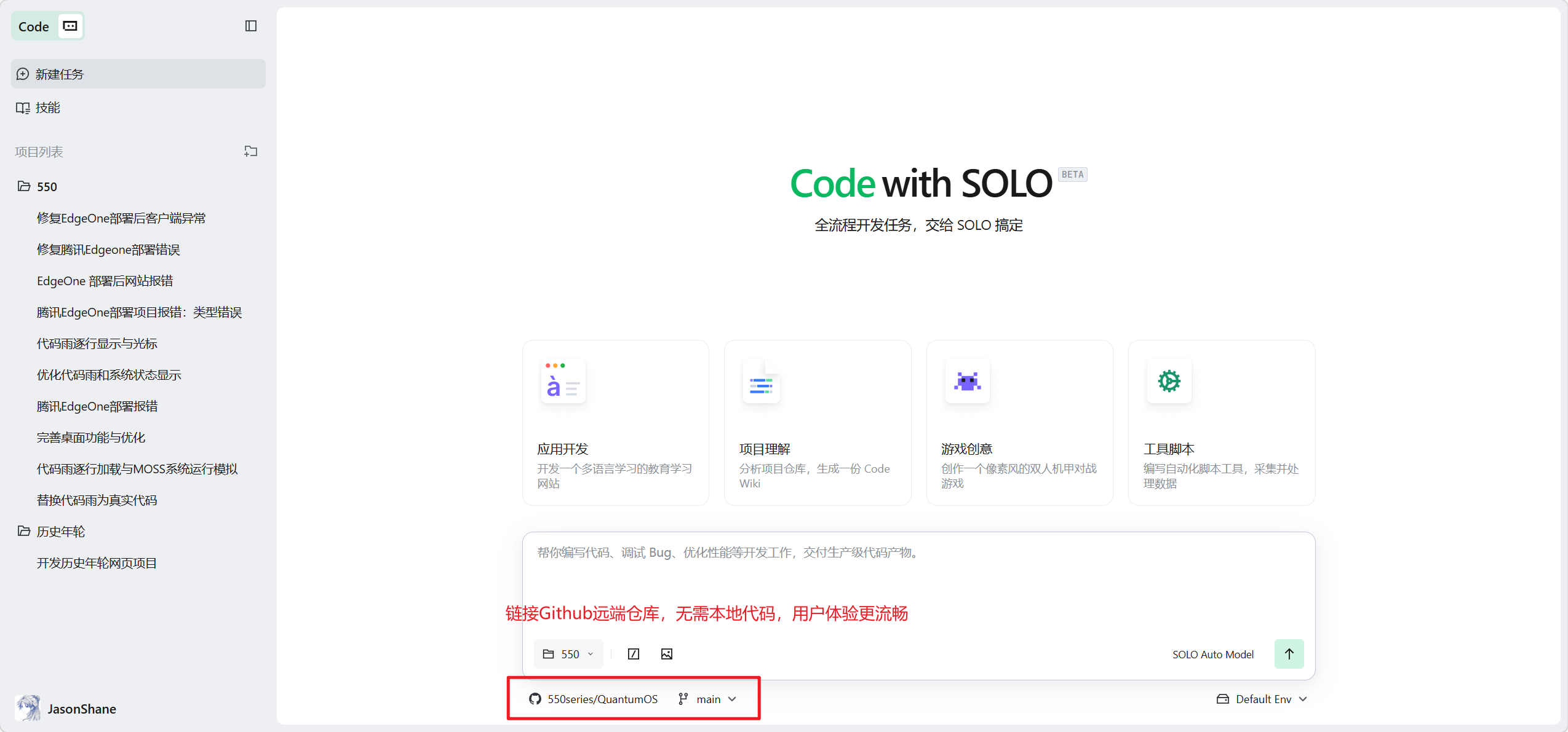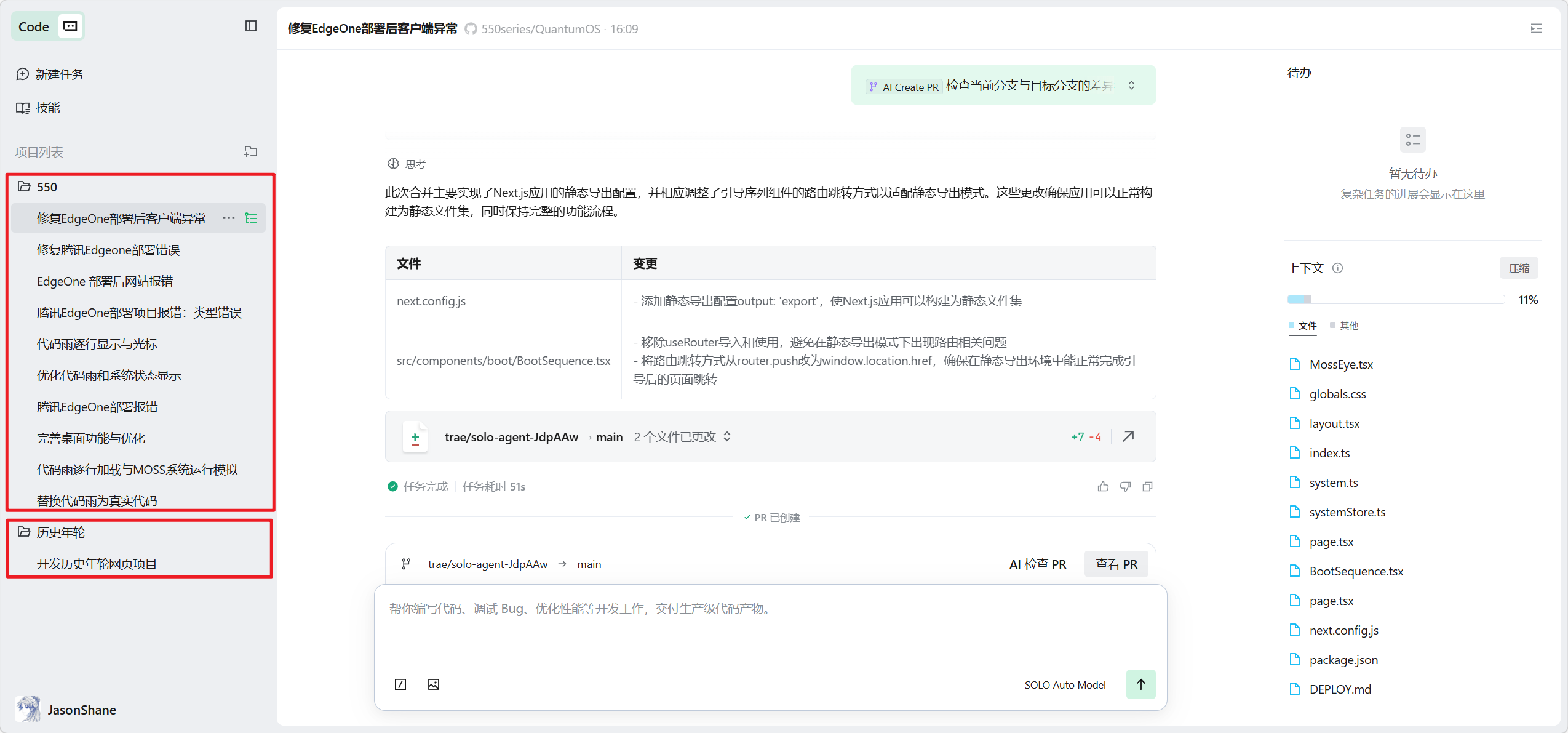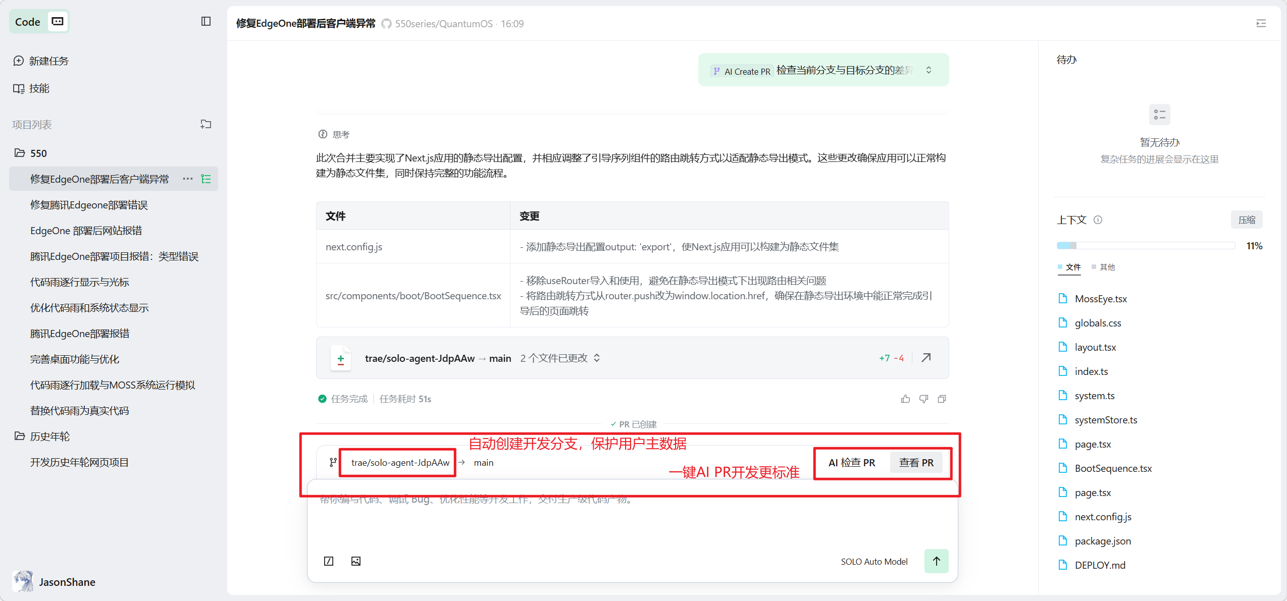 新SOLO本次可以直接链接用户的Github仓库,无需clone你的远端代码(上文提到),直接告诉SOLO你想如何继续开发!并且任务完成后同步可以让AI提交PR(远端仓库的SOLO开发都默认新建分支,不污染你的主分支或者生产分支,满意后再PR合并,充满安全感),也不要用户自己总结PR内容(少掉几根头发!)