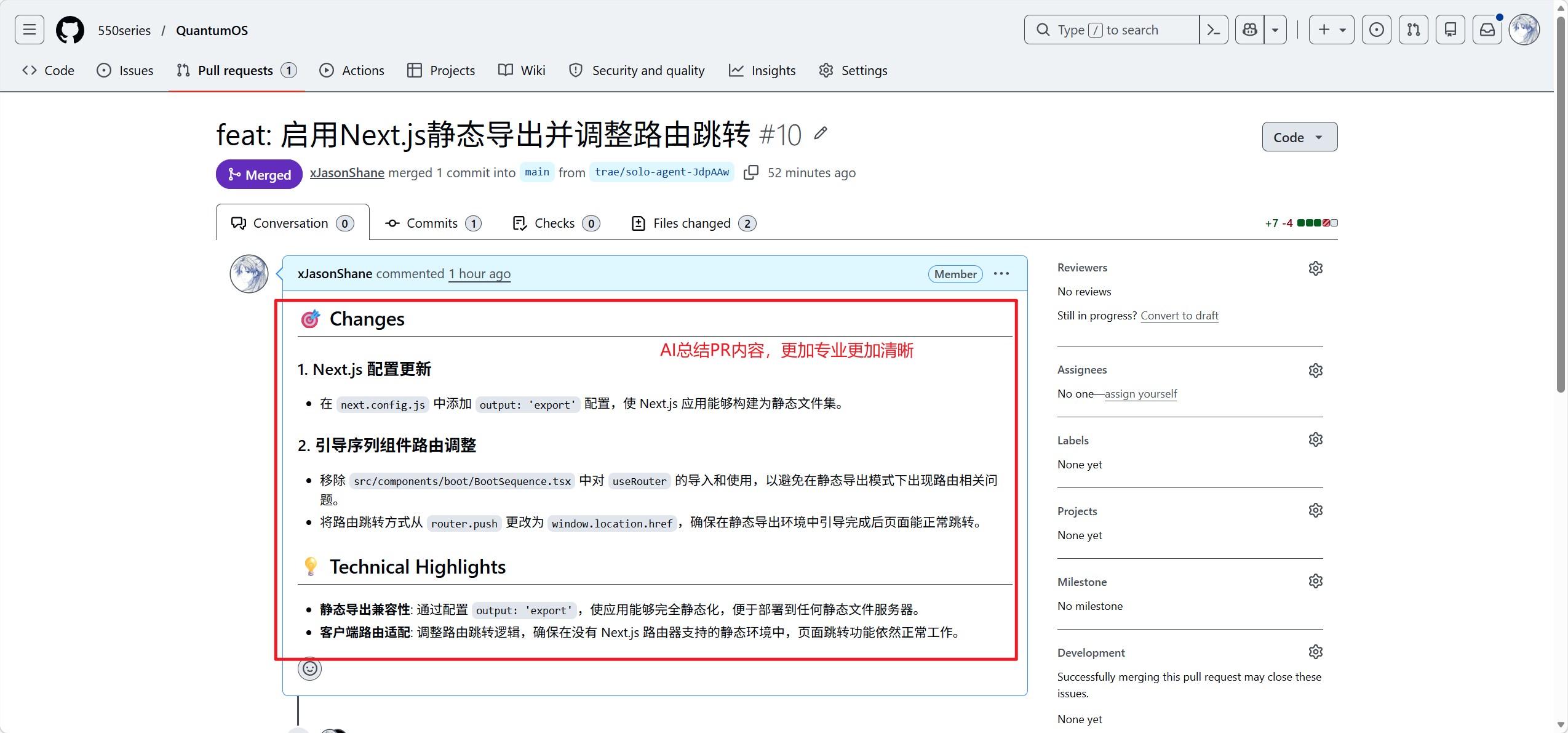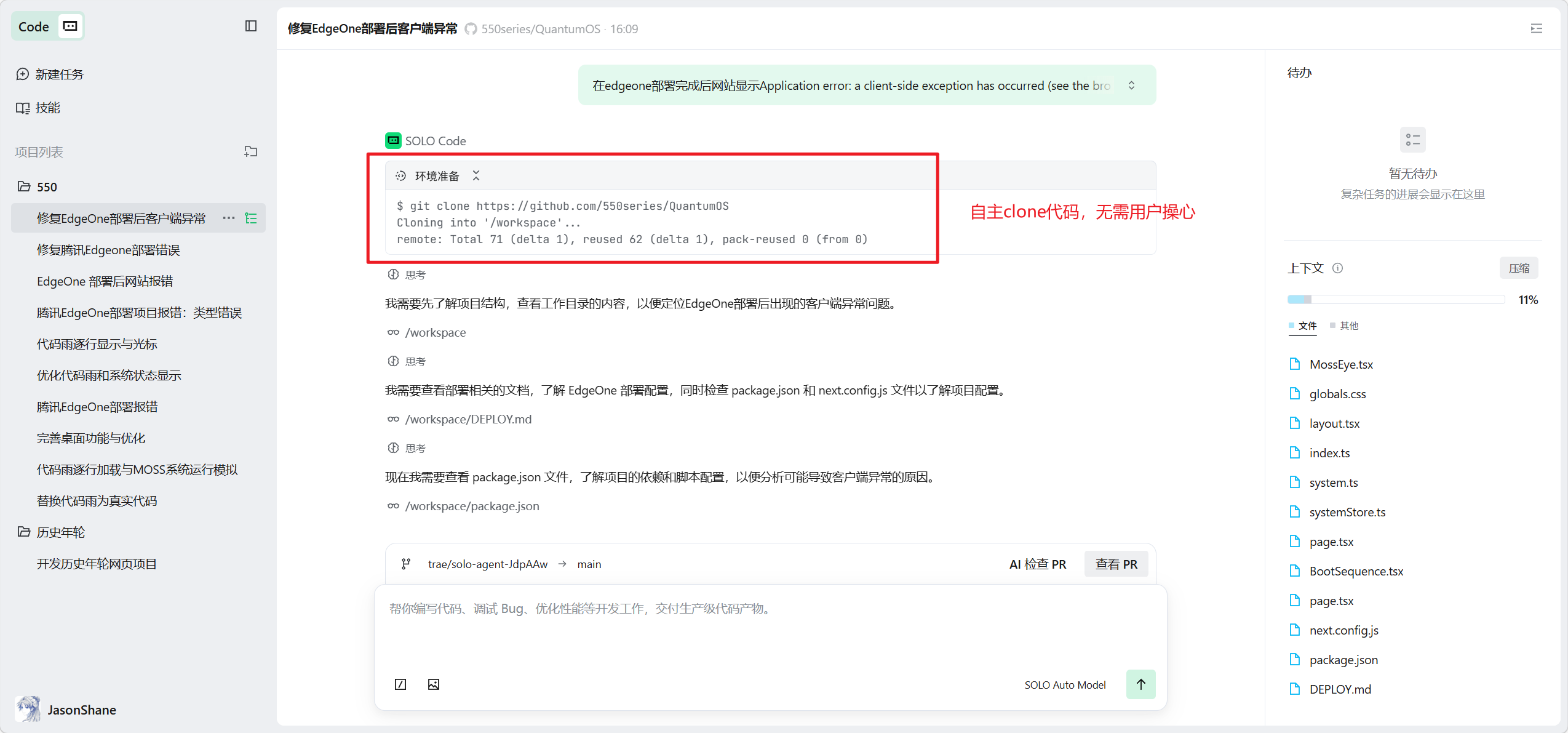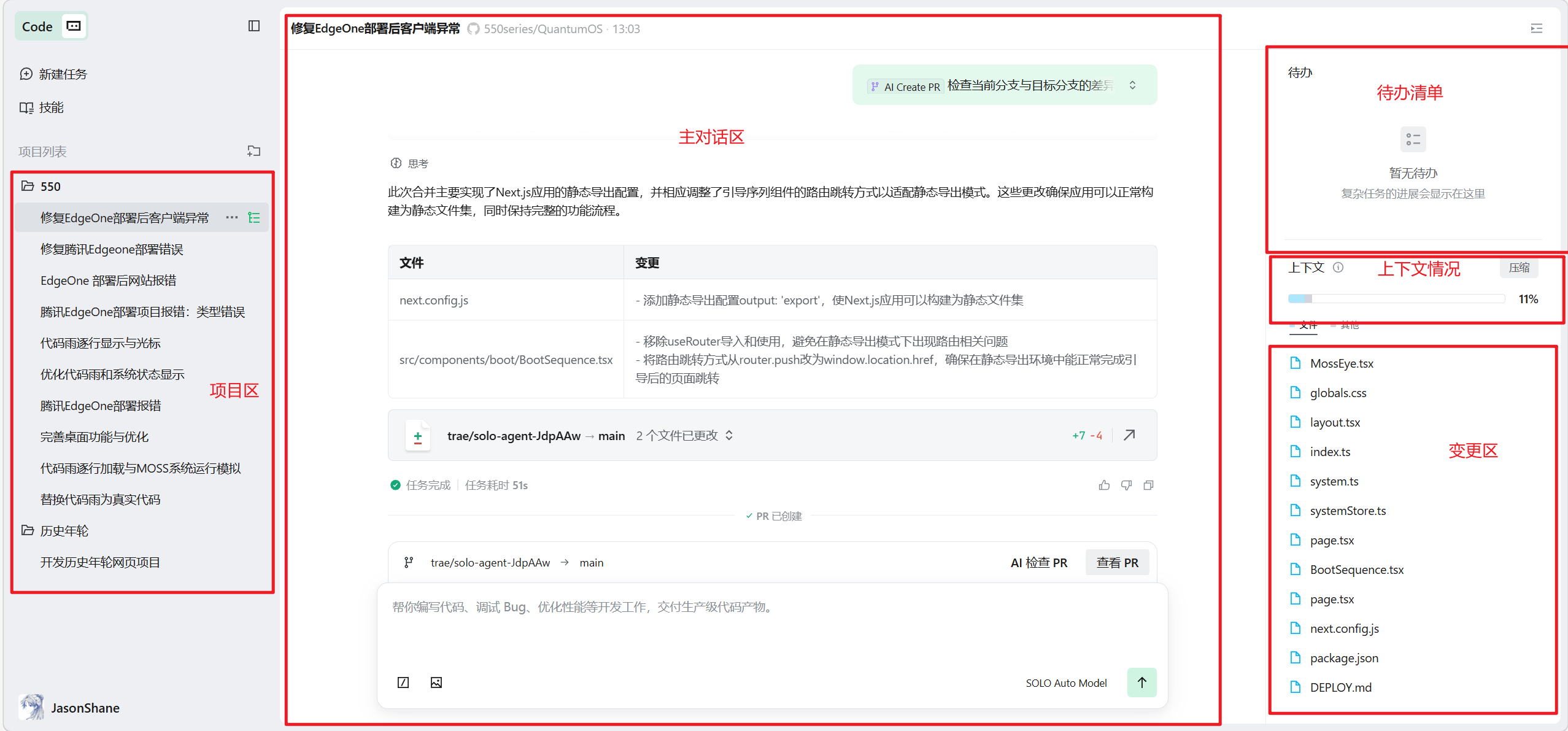 新SOLO本次可以直接链接用户的Github仓库,无需clone你的远端代码(上文提到),直接告诉SOLO你想如何继续开发!并且任务完成后同步可以让AI提交PR(远端仓库的SOLO开发都默认新建分支,不污染你的主分支或者生产分支,满意后再PR合并,充满安全感),也不要用户自己总结PR内容(少掉几根头发!)