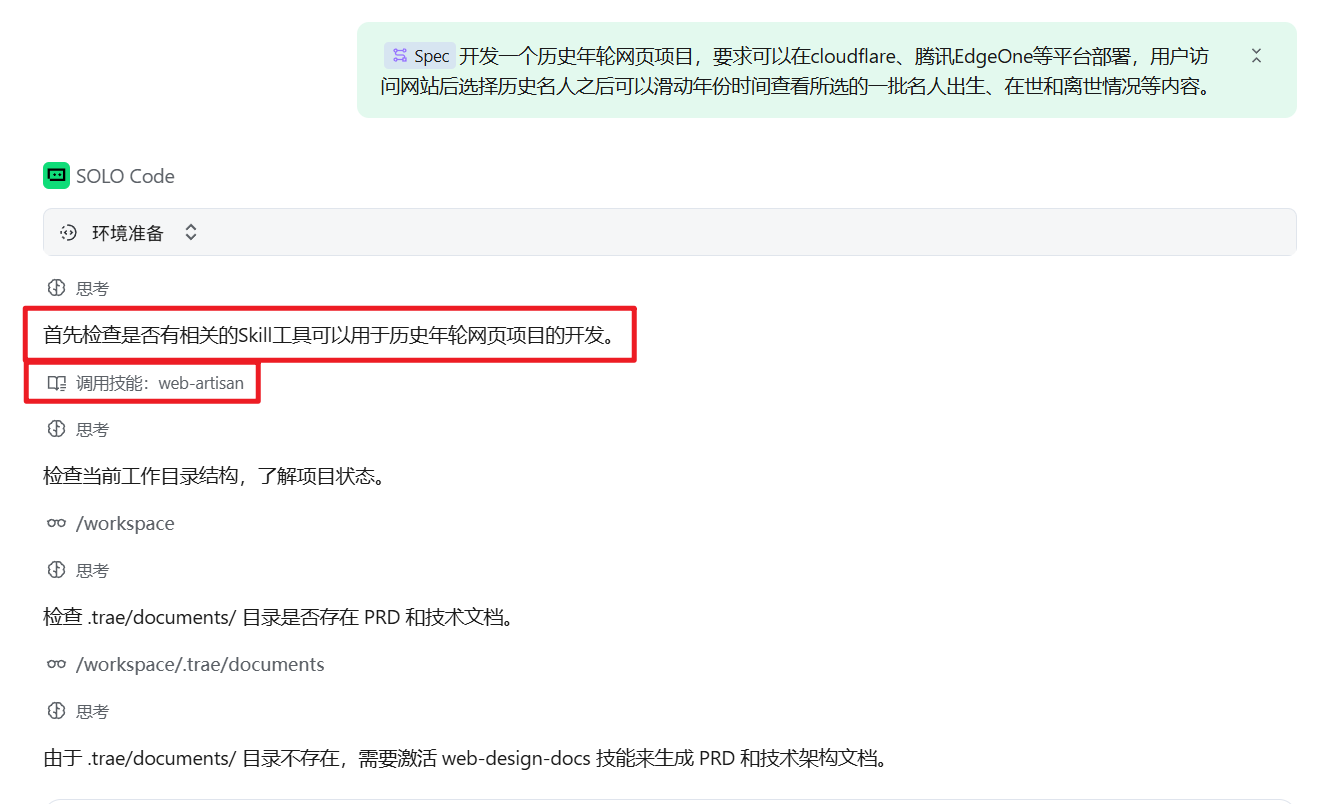 新SOLO内置了很多常用的Skill,并且同样支持上传自定义的Skill,提到Skill肯定有人喜有人愁,因为在以前TRAE中即便安装了Skill,还是有很多用户发现IDE调用Skill并不准确,但在新SOLO中这种问题得到了解决,用户无需要求SOLO调用Skill,也不用担心SOLO调用错误或者没有调用,本次的AI推理或思维过程更加智能,它会主动搜索需要的Skill并且准确调用!