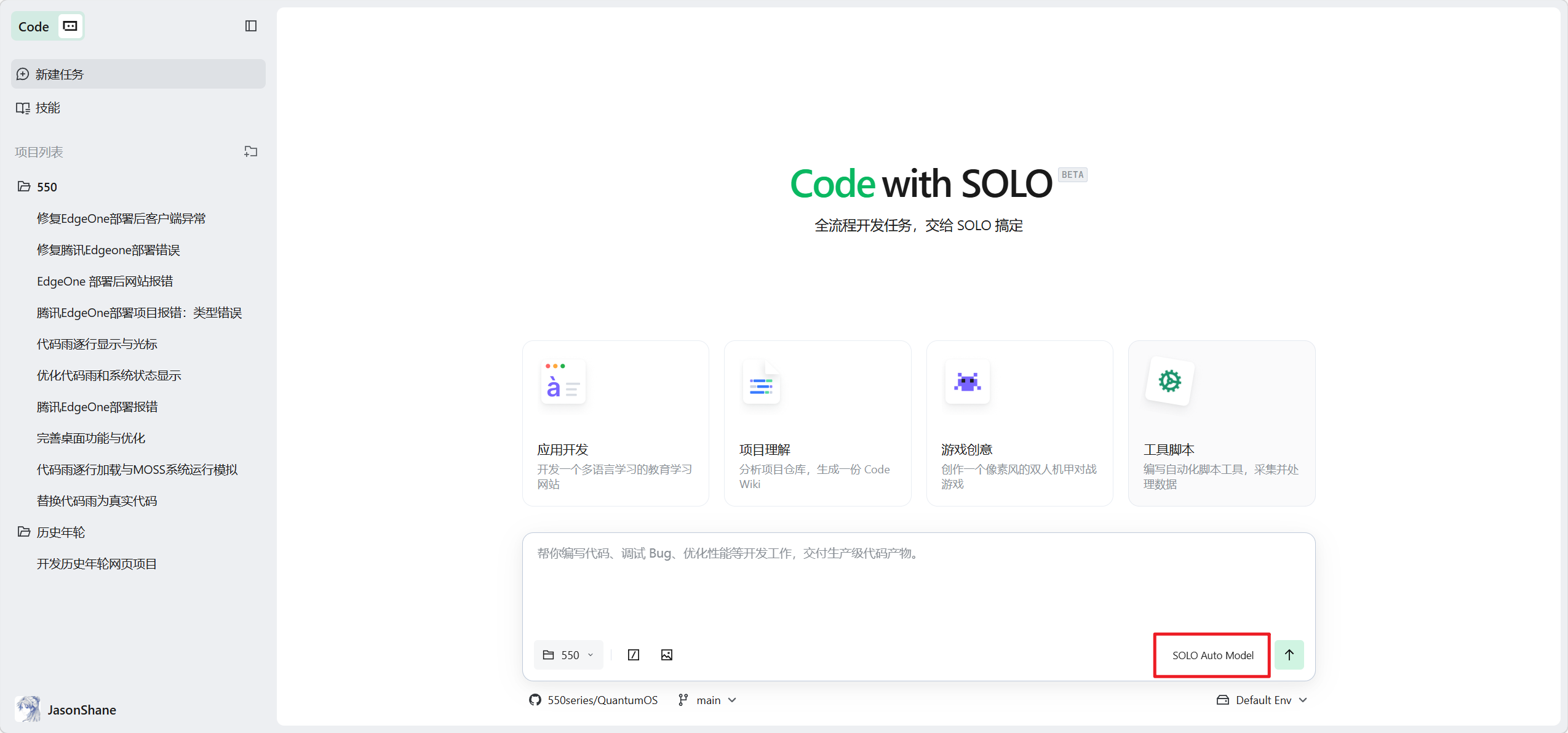 新SOLO网页版(桌面端是否一致我不太清楚)弱化了以前IDE的项目文件夹概念(以前IDE为了区分一般都是一个项目文件夹打开一个桌面端,但是新SOLO一个页面用户自己创建项目清单),用户可以根据需求创建项目区分,将不同项目能够一个页面同时展示和运行!