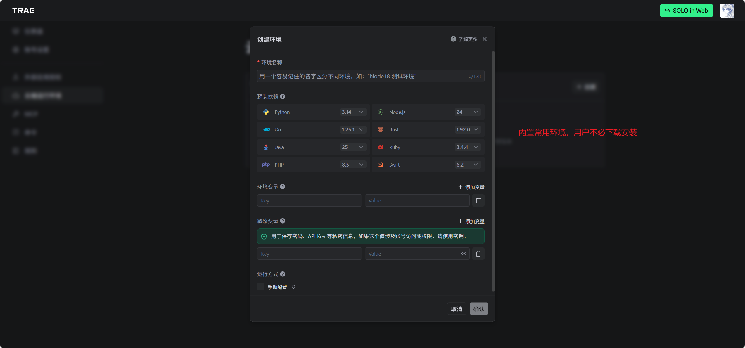 本次网页版(桌面端我这边暂不清楚)采用的是云端环境,用户不用配置复杂的环境,不用输入各种命令,SOLO自己一个“人”搞定!并且官方也给用户自己配置云端环境的入口,属于编程小白的天堂体验!