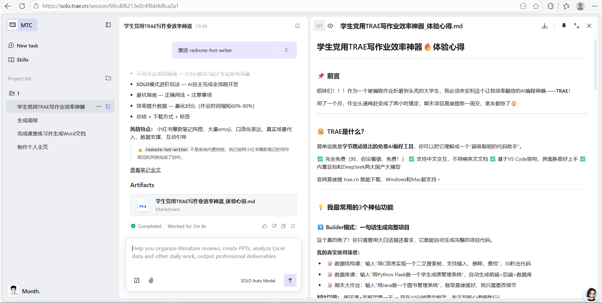 激活 rednote-hot-writer 写一篇:学生党用TRAE写作业效率神器,体验心得