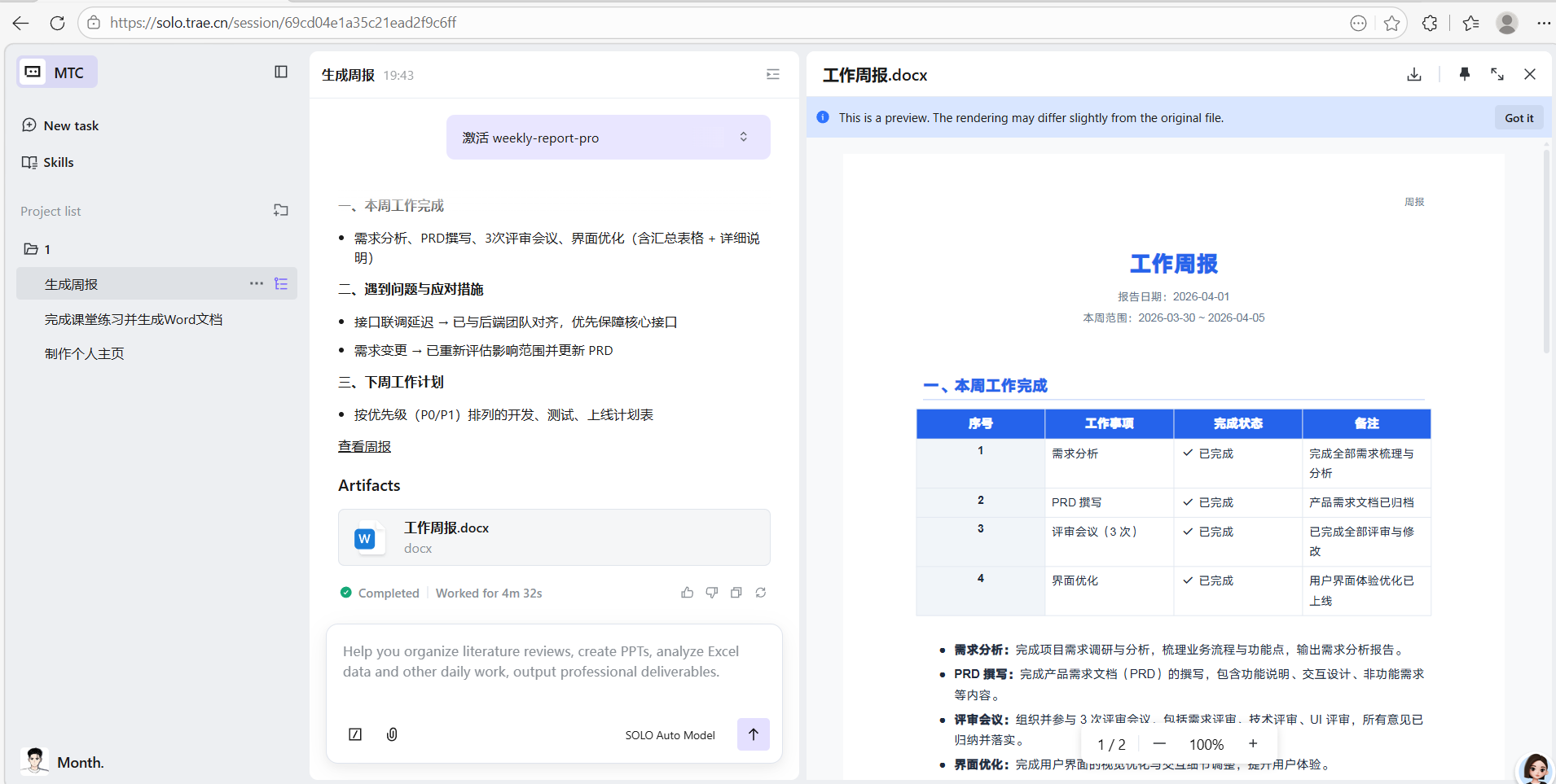 现在:5分钟,自动分模块:工作成果、问题与风险、下周计划、数据亮点,格式标准、可直接发给领导/老师