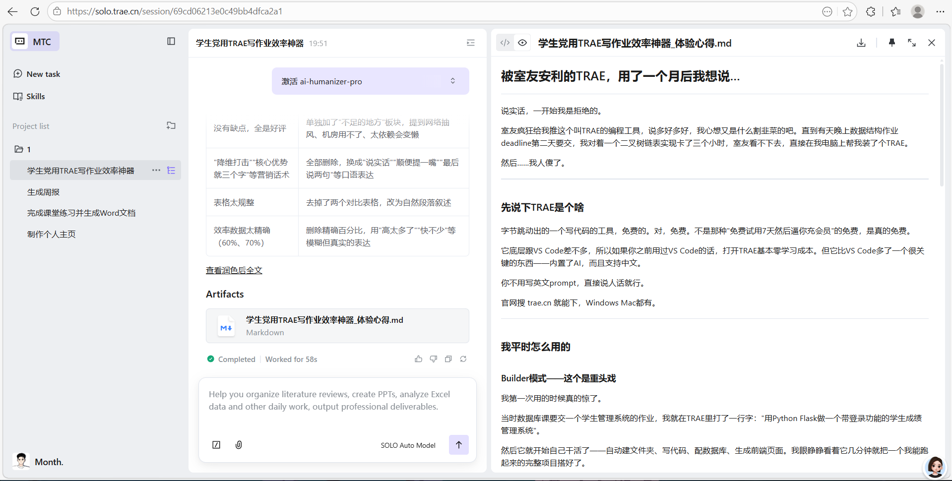 去AI味后:“真的被TRAE惊艳到!作为学生,平时写作业特别费时间,用它之后效率直接拉满,太香了!”