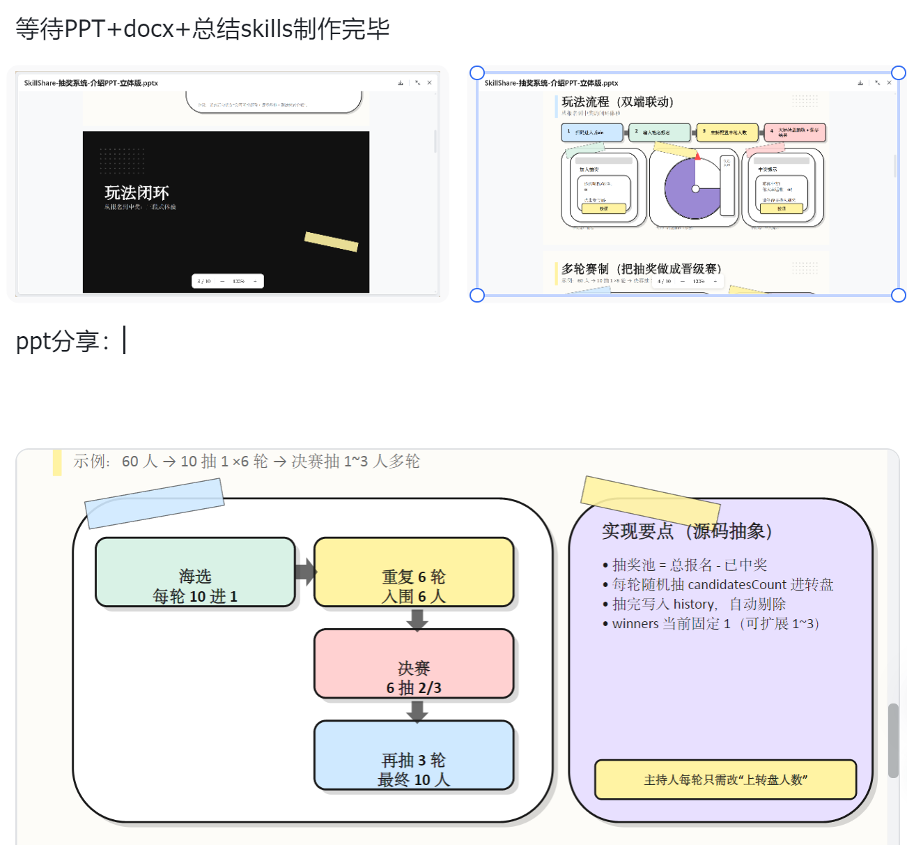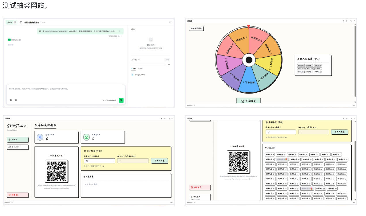 用 https://github.com/runkids/skillshare skills设计一个随机抽奖系统,台下扫描二维码输入名称。进行随机抽取。