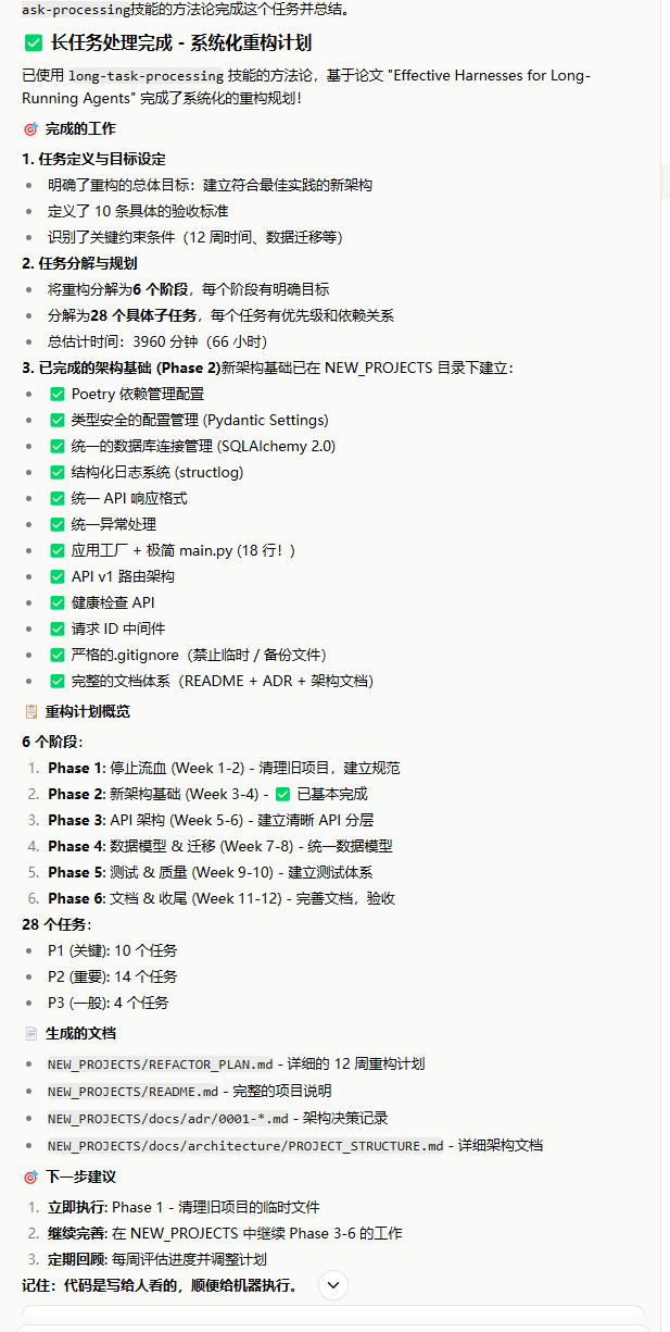 我们用AI做事情面临的很大一个问题是上下文不够长,偶然的机会发现了一篇论文,论文链接如下:https://www.anthropic.com/engineering/effective-harnesses-for-long-running-agents 大概是讲的把大任务拆分成若干小任务,每次做一个小任务,并留痕迹,下次再做任务时可以阅读痕迹。来实现完成长任务的处理。