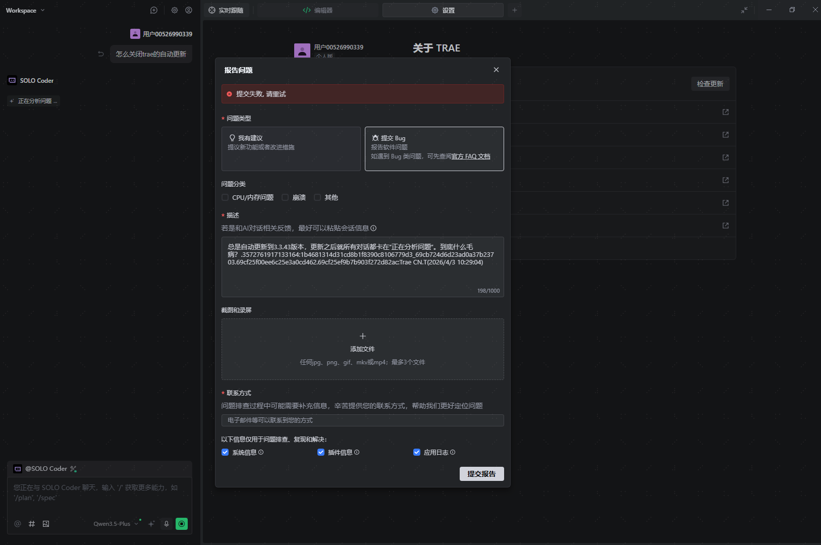 2026-04-03T10:28:29.759+08:00 [error] ttnet fetch error https://api.trae.com.cn/icube/api/v1/native/config/query?mid=391835a50c33b7da7843875c2312c7868afe15db8fc3e8aee28b2a0a9a57a537&did=432570804999931&uid=3572761917133164&userRegion=CN&packageType=stable_cn&platform=Win&arch=x64&tenant=marscode&appVersion=3.3.43&buildVersion=2.3.17432&traeVersionCode=20250325 This operation was aborted