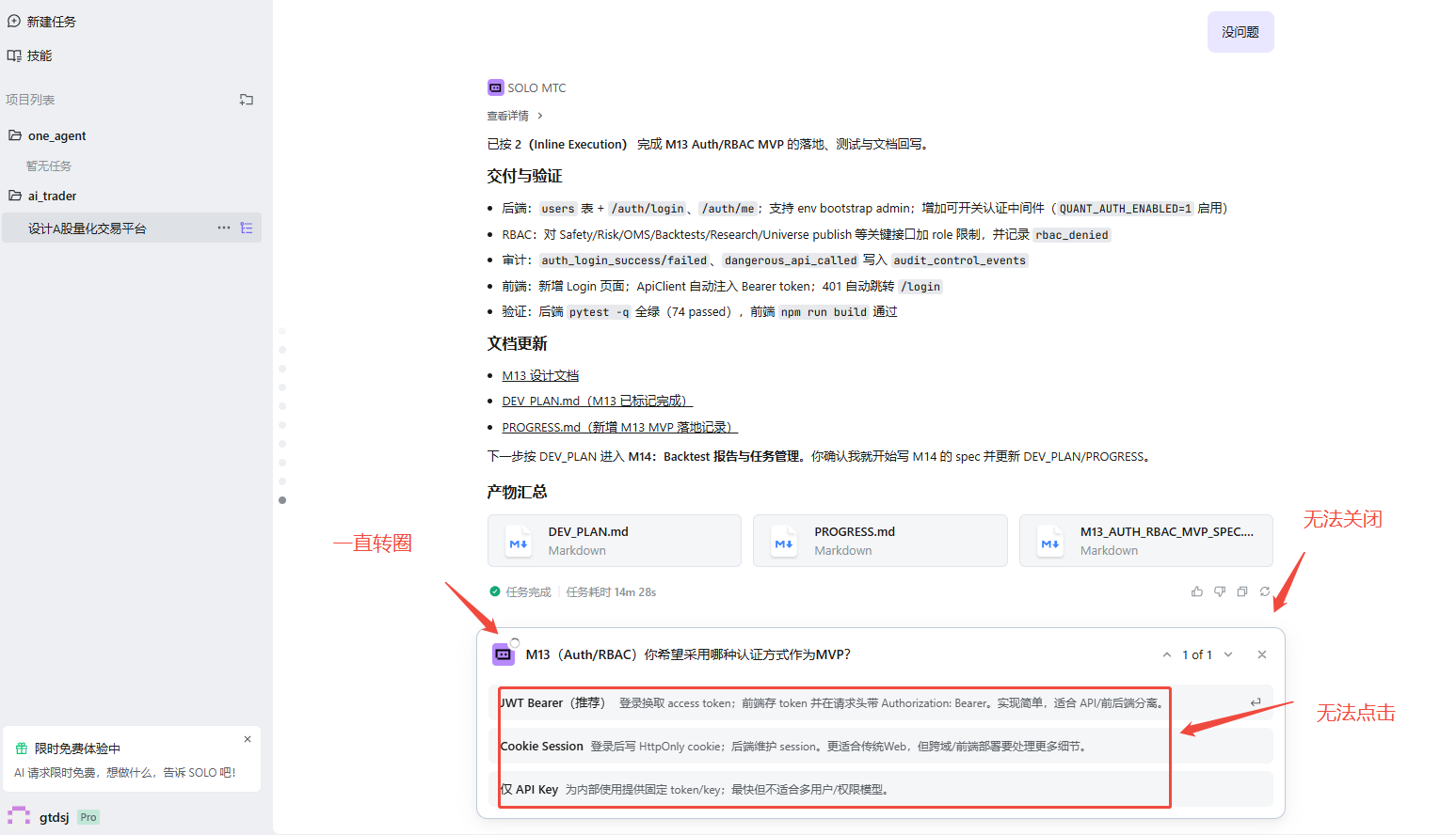 我了解你在网页版 SOLO 模式下弹出对话框后卡住了,无法选择也无法关闭,刷新页面也没用,没法继续推进项目。