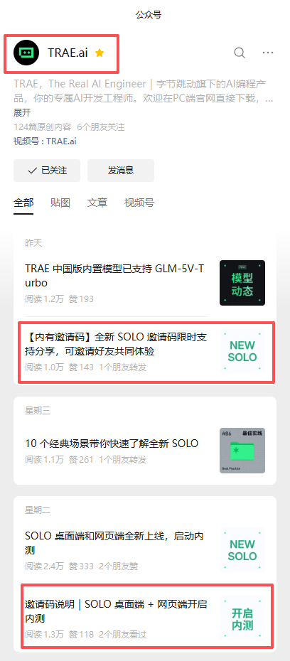 渠道五:TRAE.ai 官方微信公众号不定时发布文章 蹲它