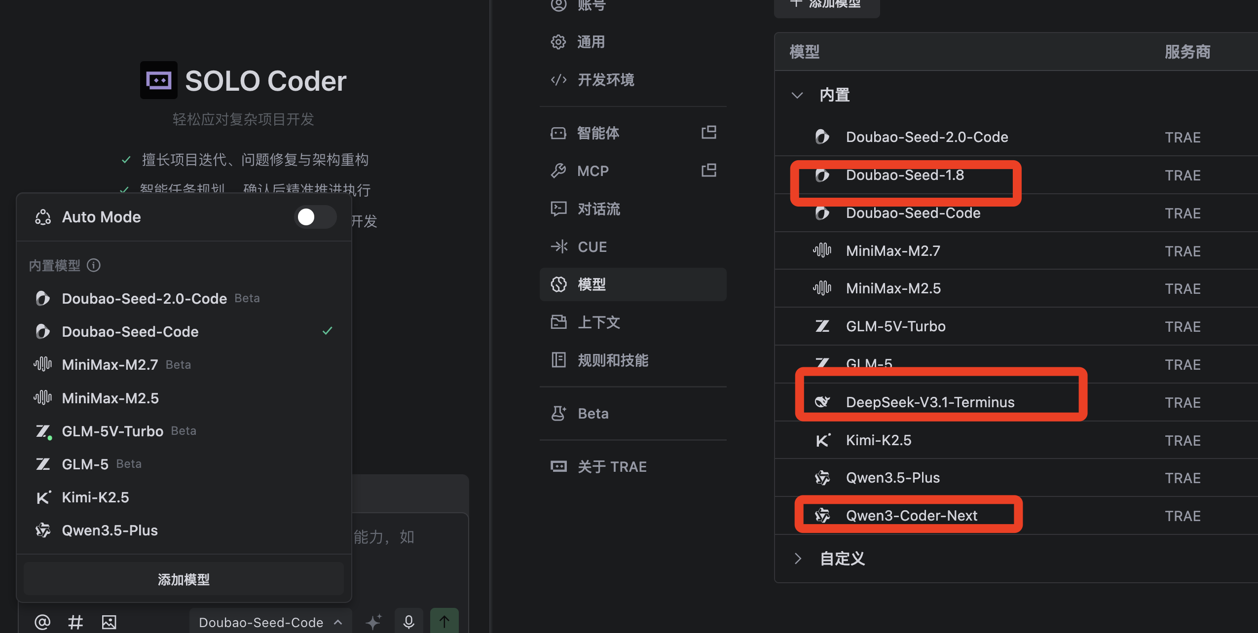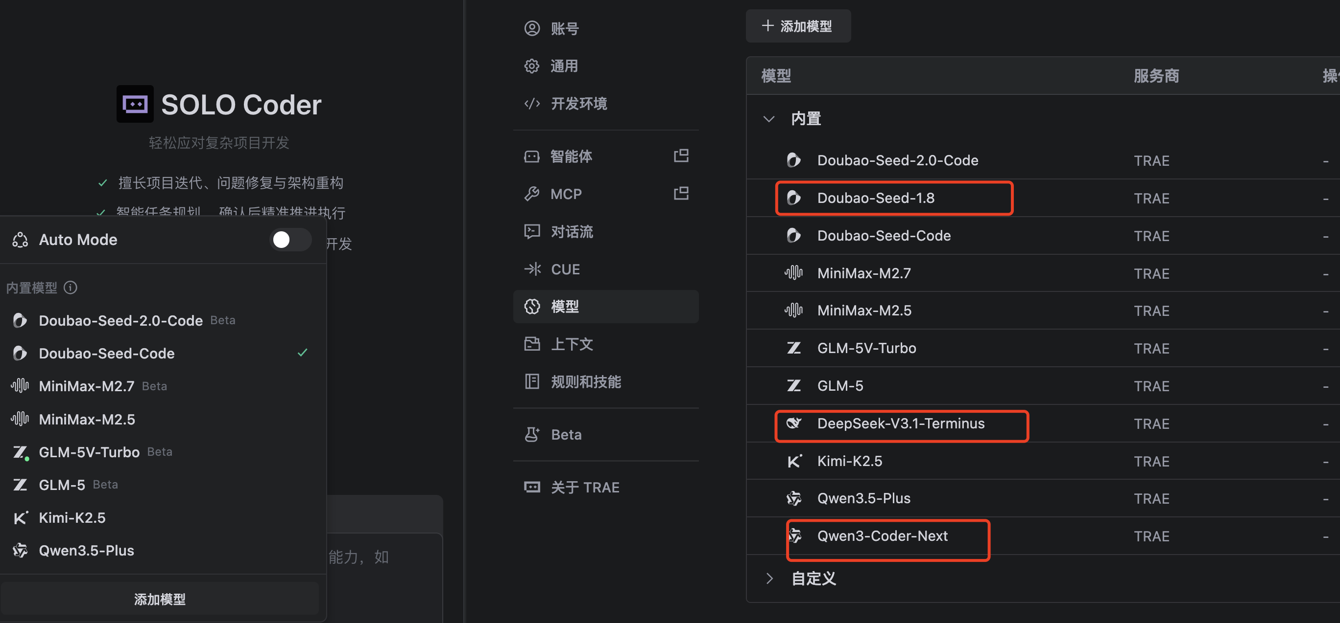 你可以先切换回普通的 Coder 模式,再看看这三个模型是否能正常显示和选择了?
