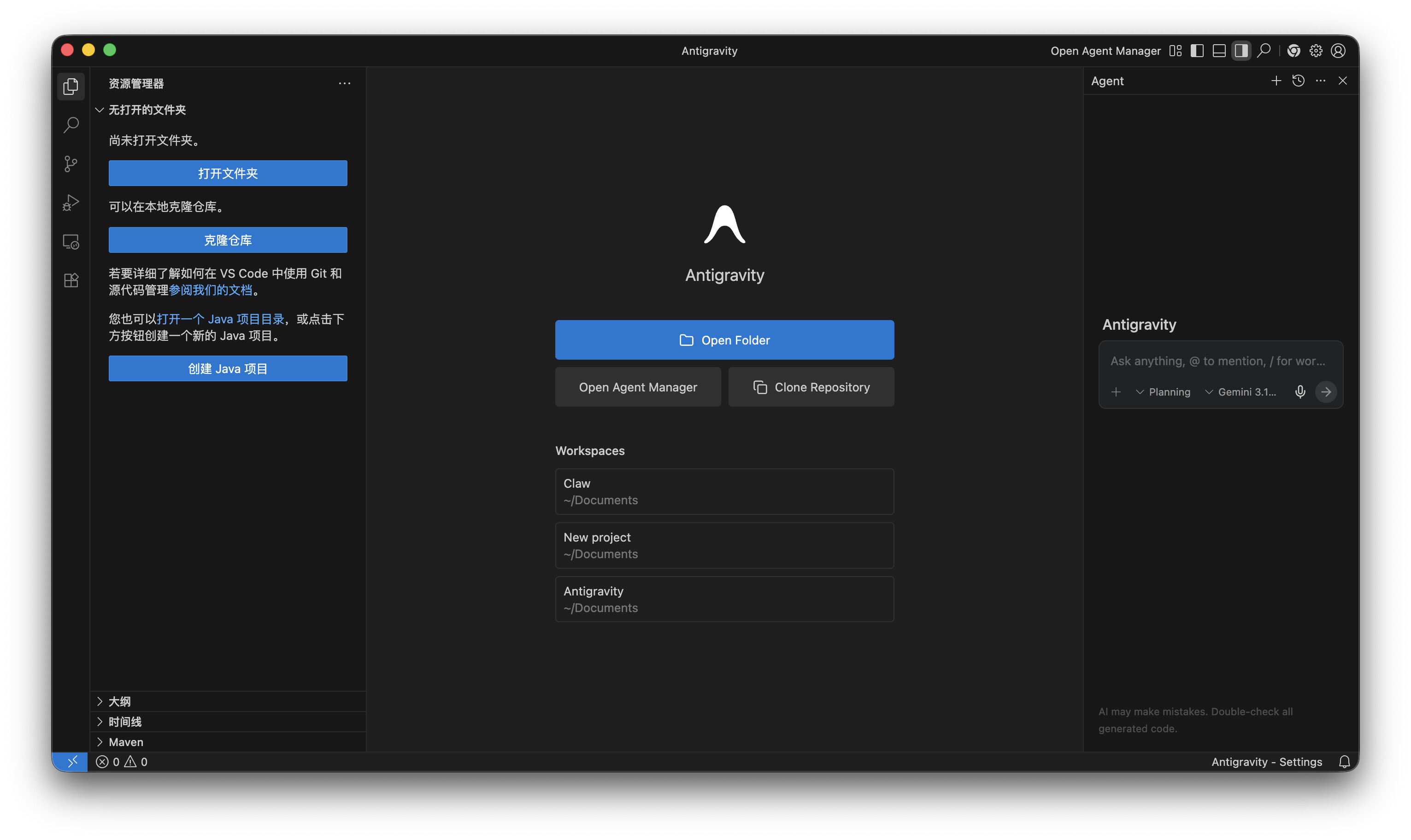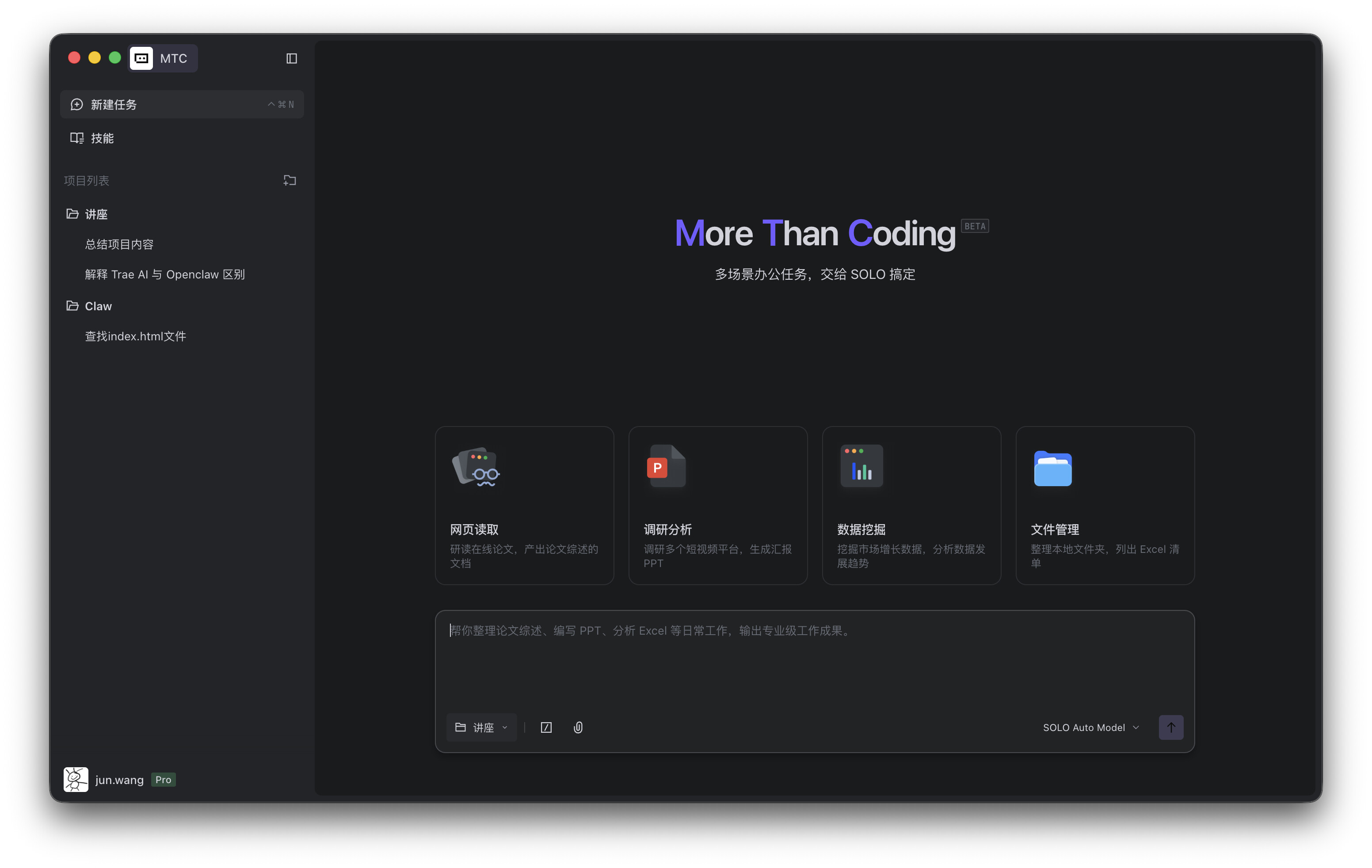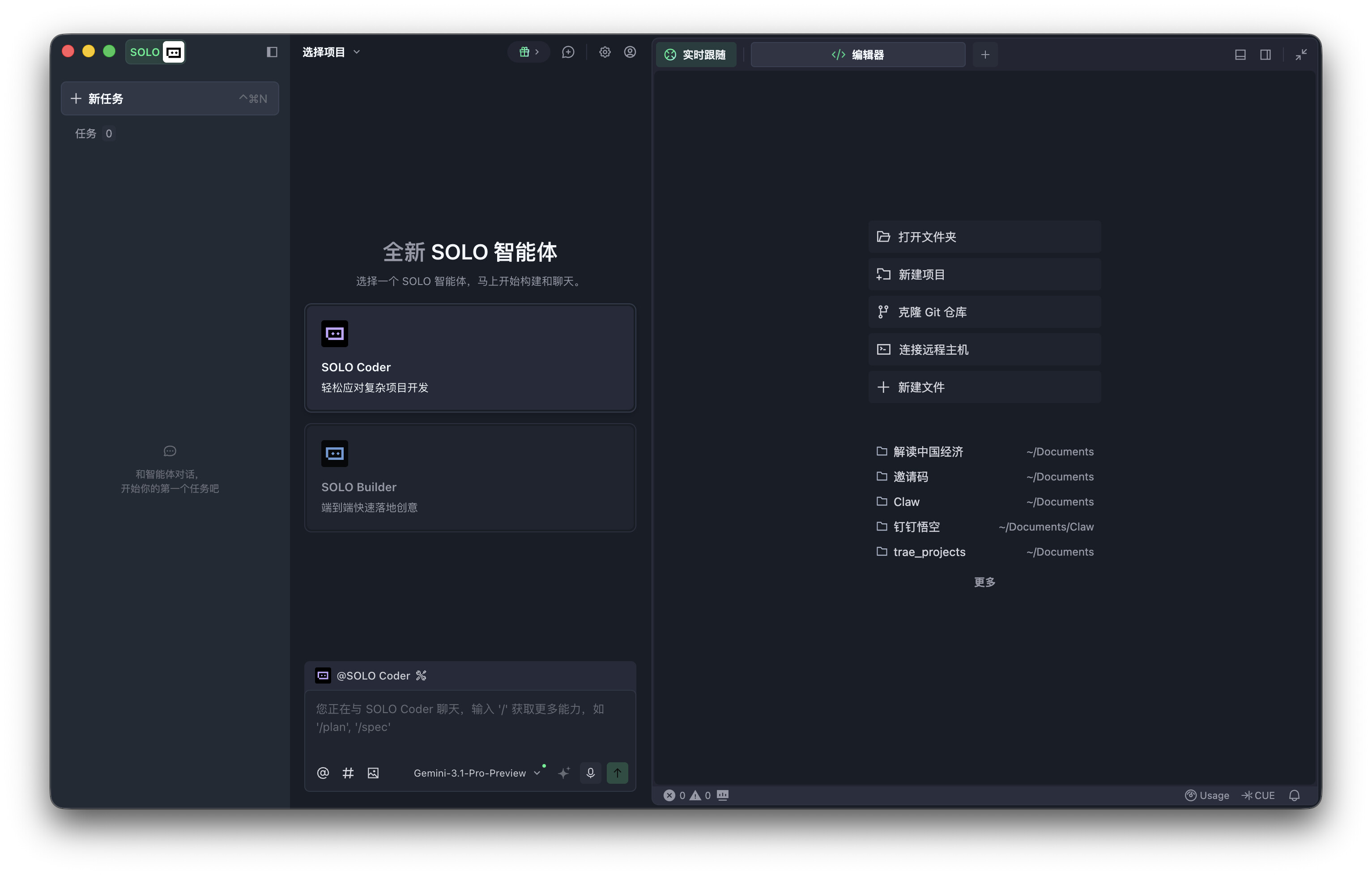 与旧版的TRAE相比,新SOLO的页面改动较大。旧版的TRAE长得就很IDE,一眼就能看出它跟Antigravity是一个物种。