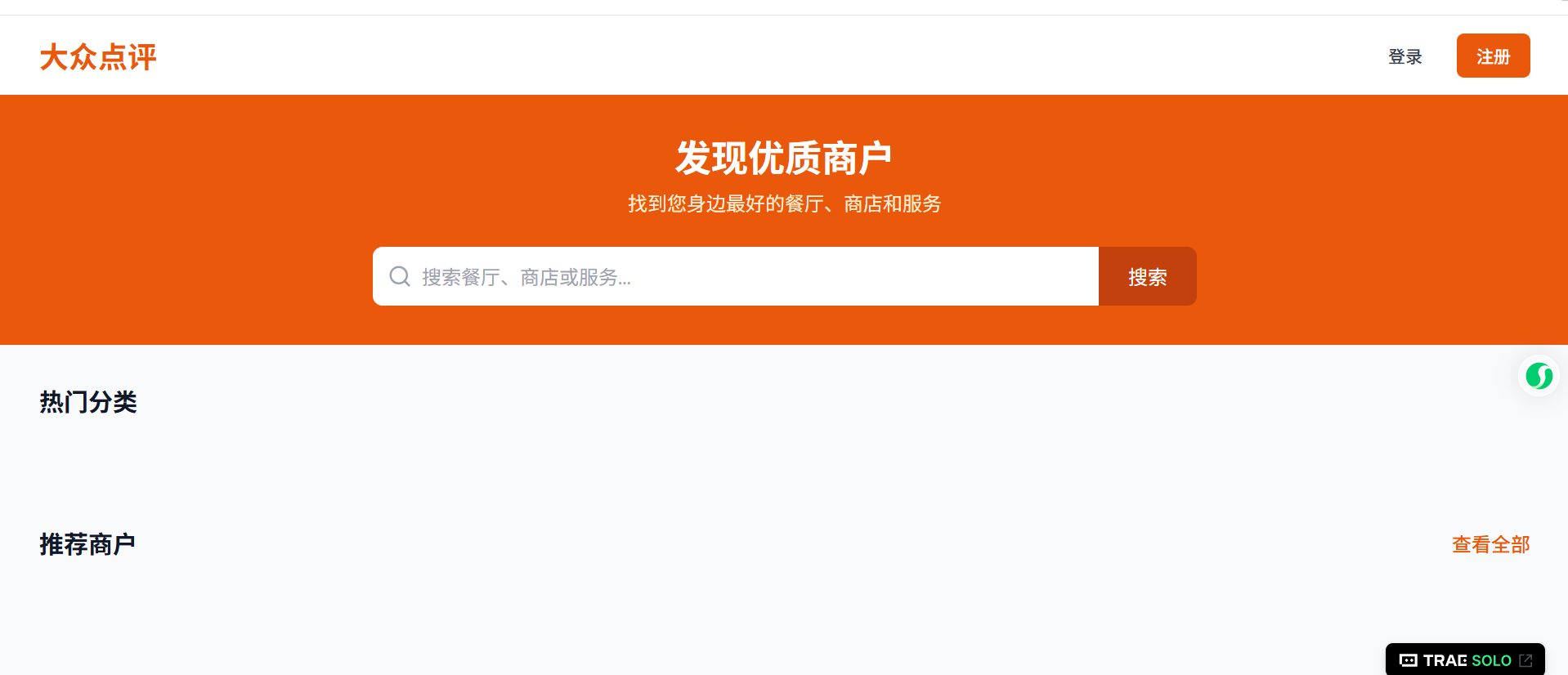 1.输入:设计并实现一个简化版的大众点评类网站应用,包含以下核心功能模块:用户注册登录系统、商户信息展示页面、基础评分评论功能、商户搜索与分类浏览、用户个人中心。要求采用响应式设计确保在PC端和移动端都有良好体验,实现基本的数据增删改查操作,集成用户认证与权限管理,添加适当的输入验证与错误处理机制。项目需包含完整的前后端分离架构,前端使用主流框架开发,后端提供RESTful API接口,数据库设计需支持商户信息、用户信息、评论数据的高效存储与查询。完成基本功能开发后,需进行功能测试、性能优化,并部署到服务器环境确保可正常访问使用。