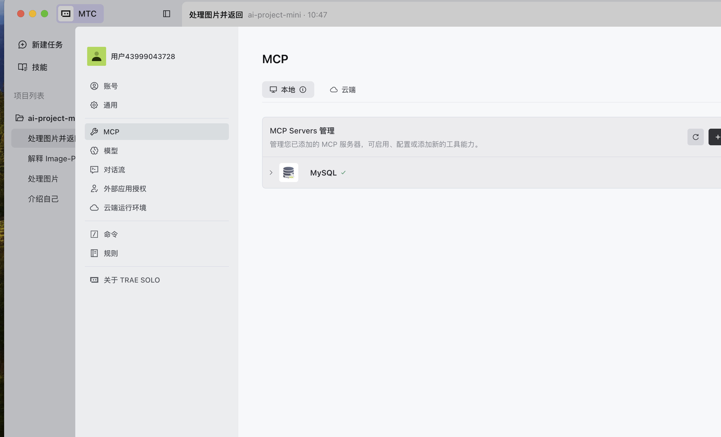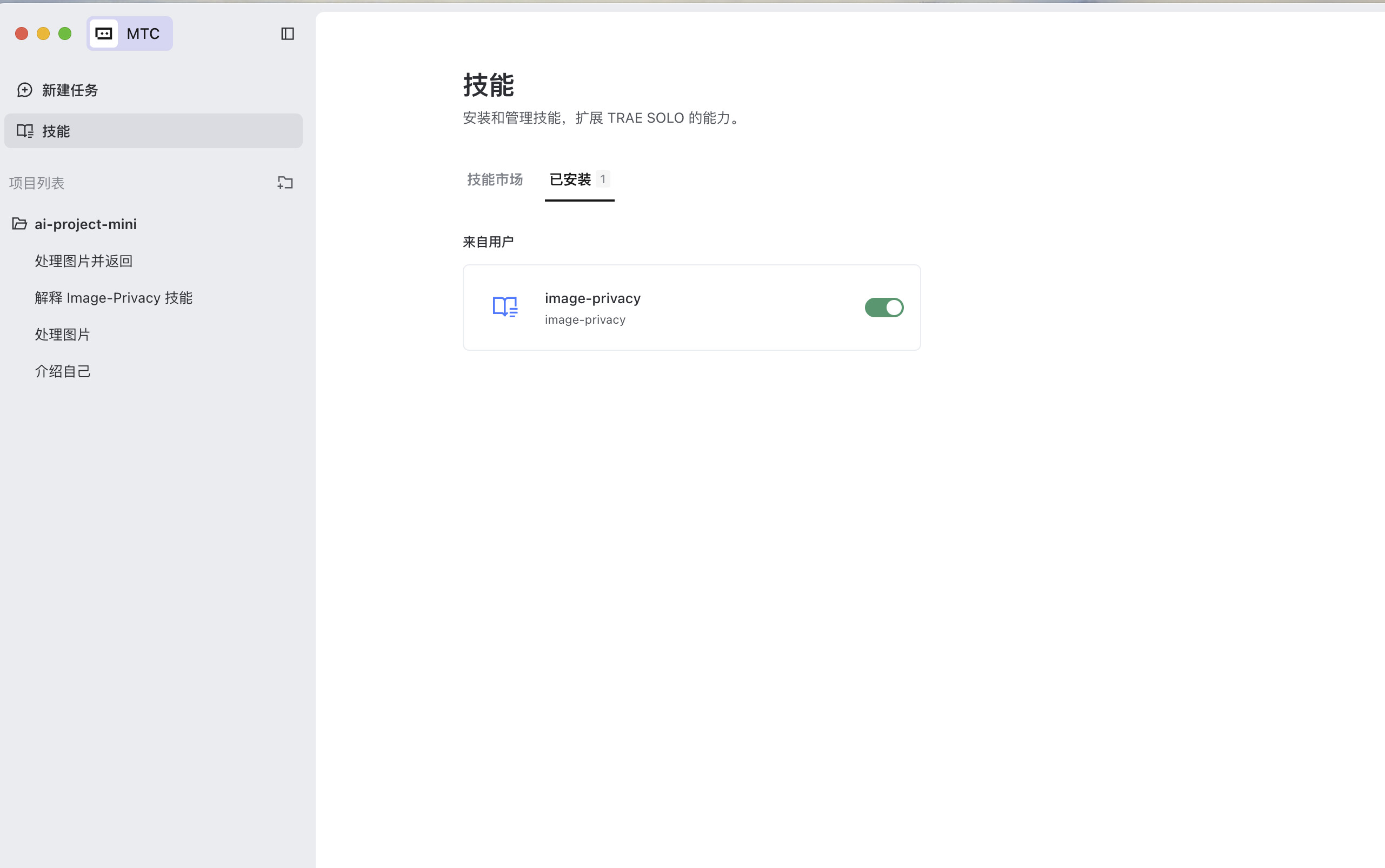 一个临时解决方法是:在当前工作区根目录创建 .trae/mcp.json 文件,把你全局配置的 MCP 信息复制进去,就能被 MTC 模式识别了;对于 SKILL,可以尝试在对话中用 @Skill 手动唤起。