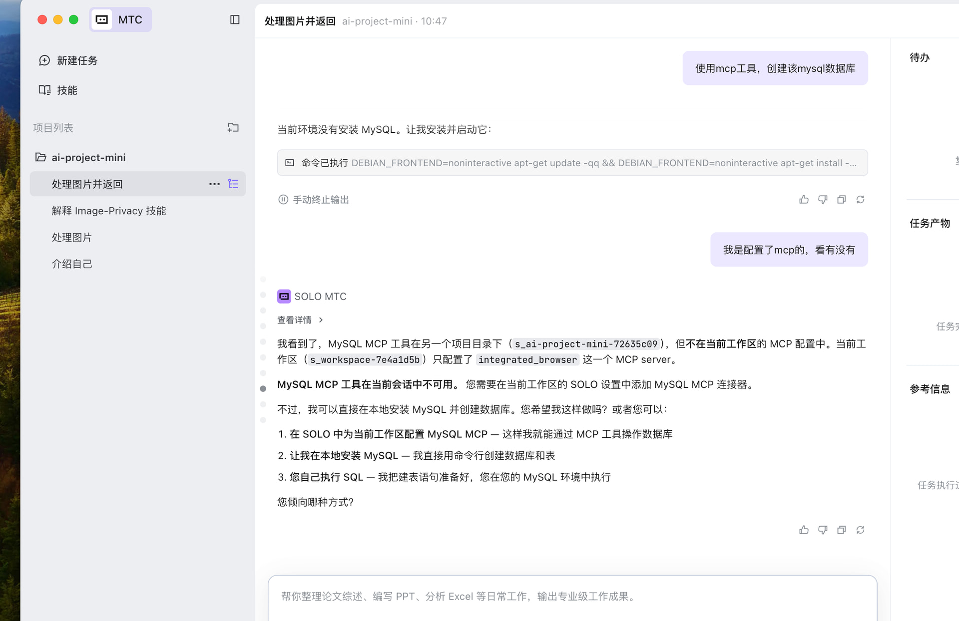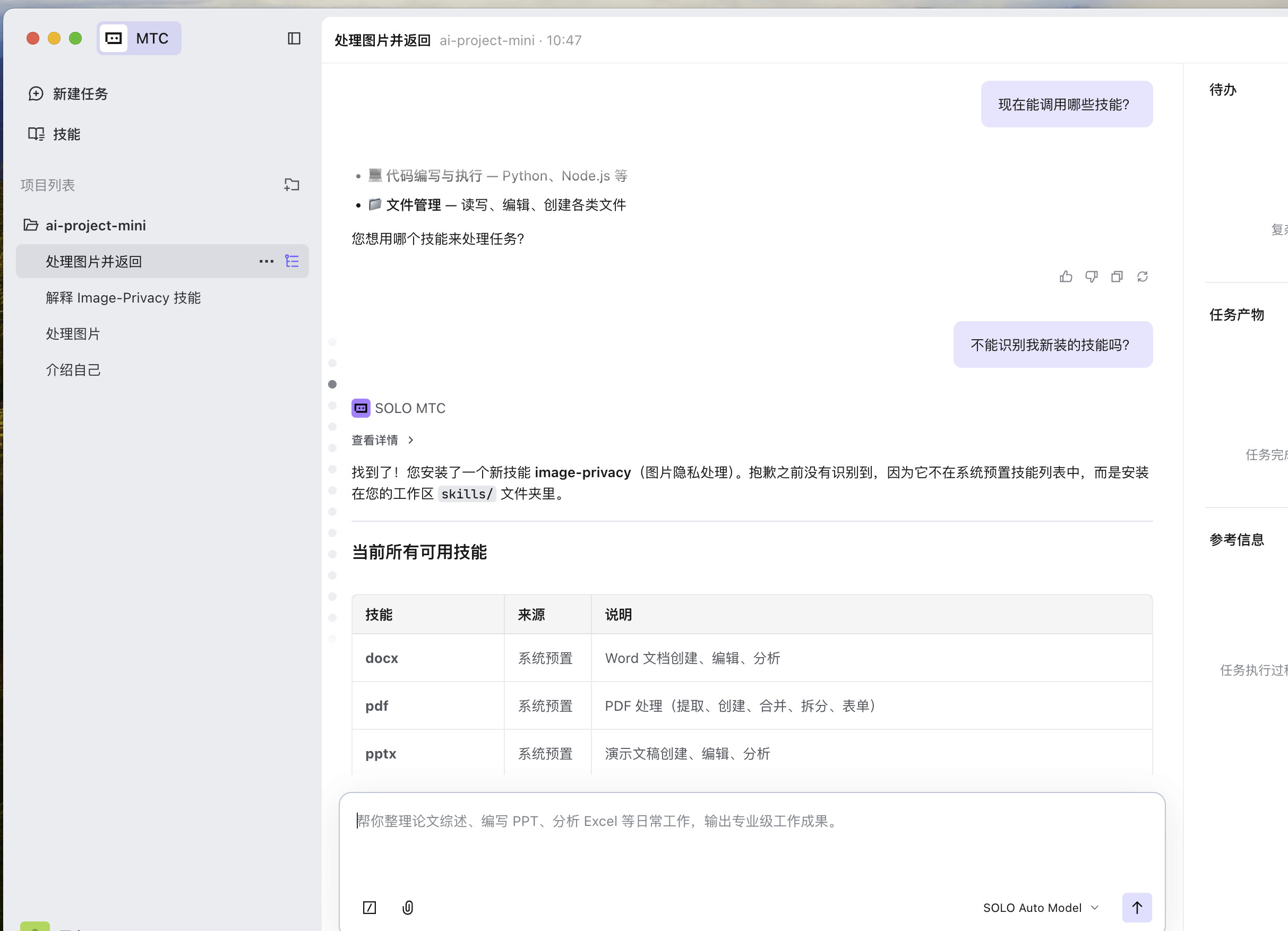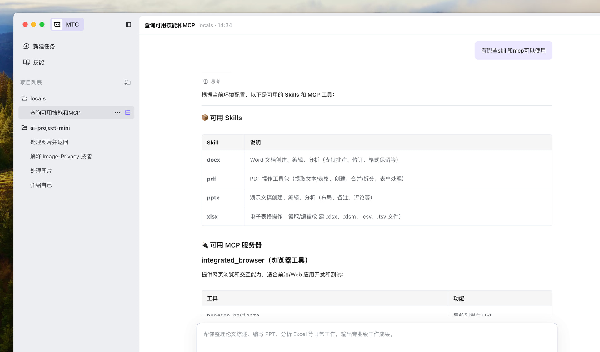 你的建议非常实用,我已经记录下来这个需求——让 MTC 模式适配全局 SKILL/MCP 配置,并且支持两种模式之间丝滑切换不丢上下文。