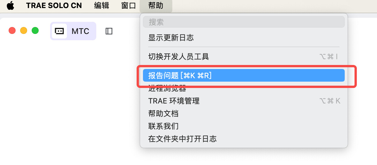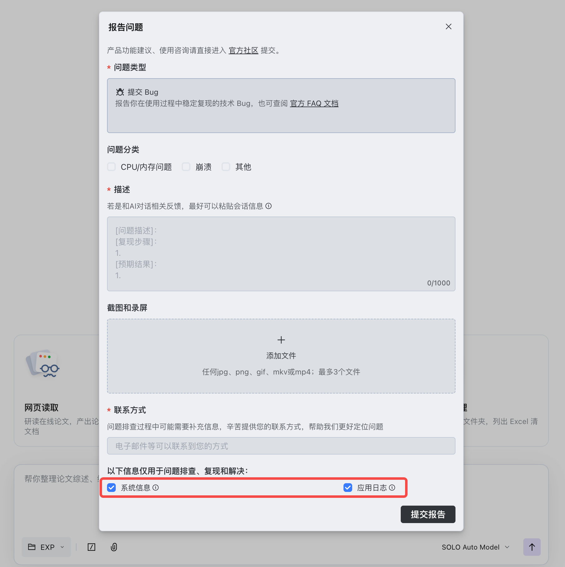 入口在「帮助」 → 「报告问题」,勾选「系统信息」和「应用日志」,描述可以简单写下。