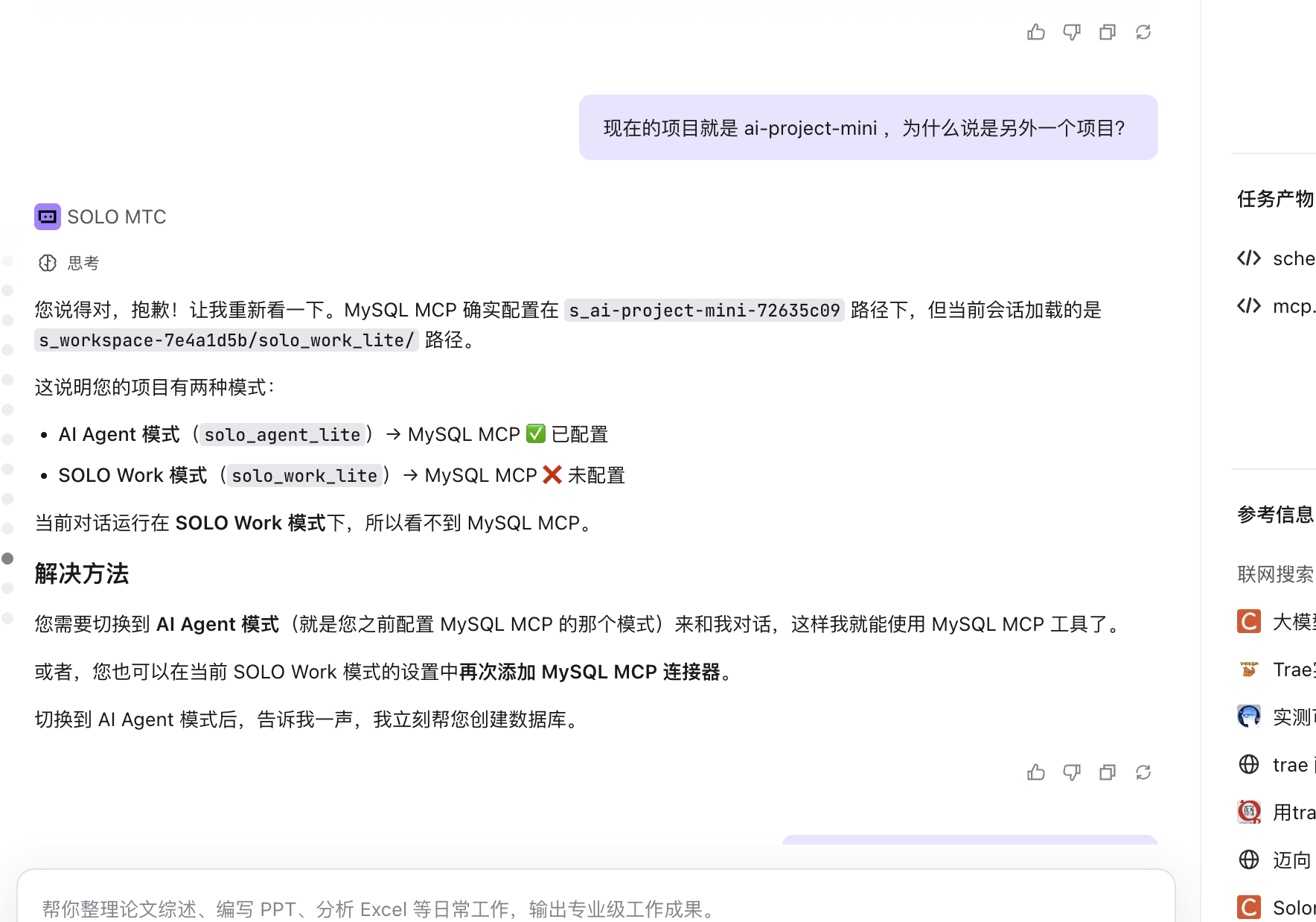 2.在MTC模式下,在设置页面中配置了MCP,也显示配置成功了,但对话说没有MCP,让他扫描说找到了,但不在当前工作区的 MCP 配置中,需要配置到工作区,给了教程但与软件不符合,也不知道怎么操作。切换到CODE后,正常使用。最重要的是,我配置了MCP和SKILL,应该是全局的,不是单独项目的。