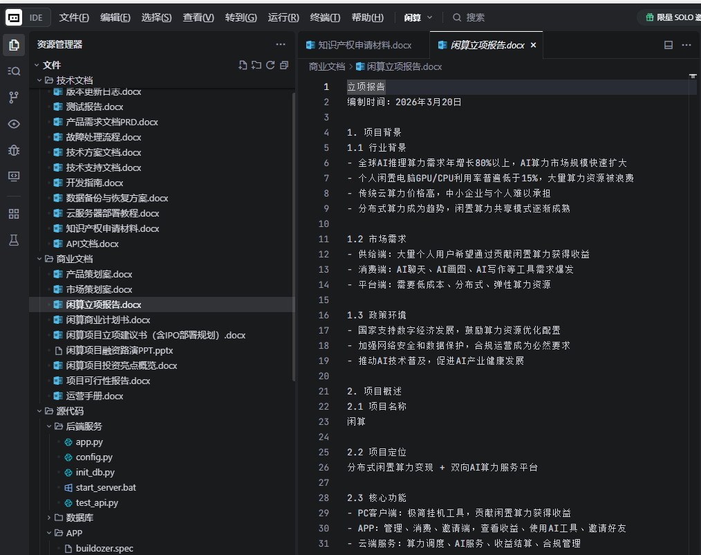 2026年3 月 20 日,闲来无事,突发奇想:用豆包 + Trae做一个分布式闲置算力交易平台,名字就叫 “闲算”。