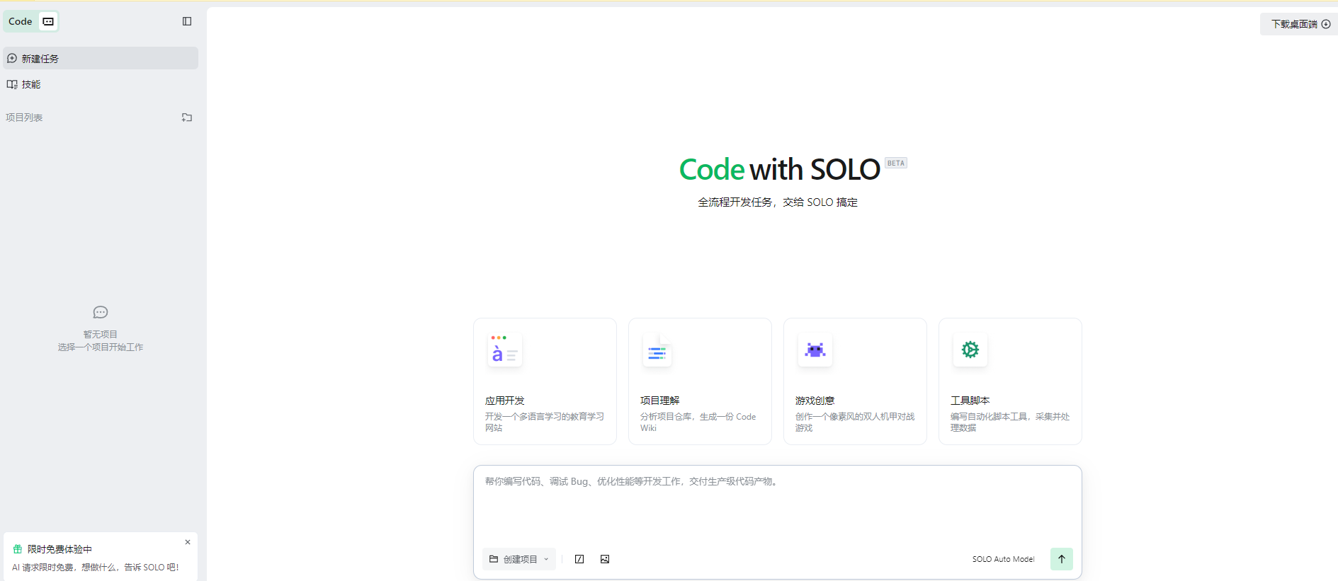 AI 主导开发:只需自然语言描述需求(如 “用 React 开发一个待办事项列表,支持本地存储”),SOLO Agent 会自动拆解任务、生成完整代码、调试运行,甚至处理 Git 冲突。