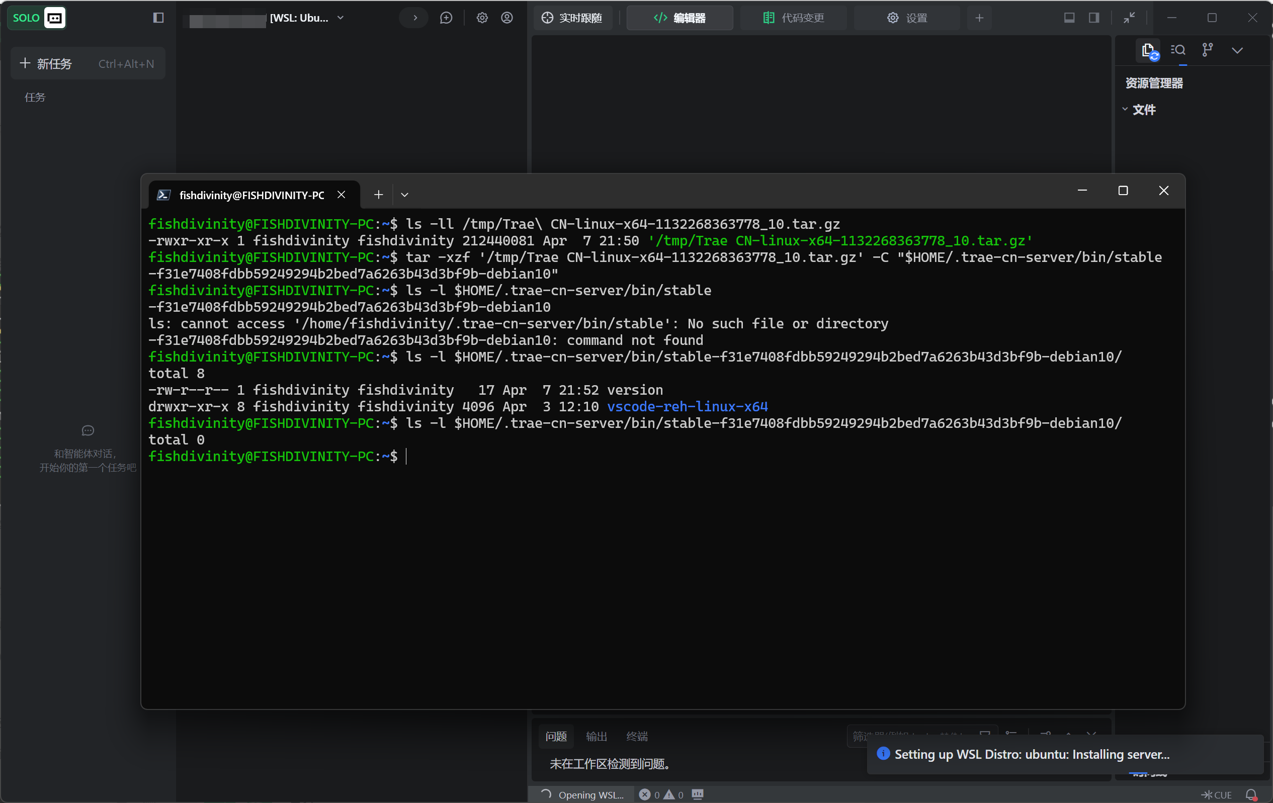 从你的截图看是连接失败,这个错误通常和 WSL 环境本身或者远程扩展加载有关,你先告诉我运行这两个命令后的结果?