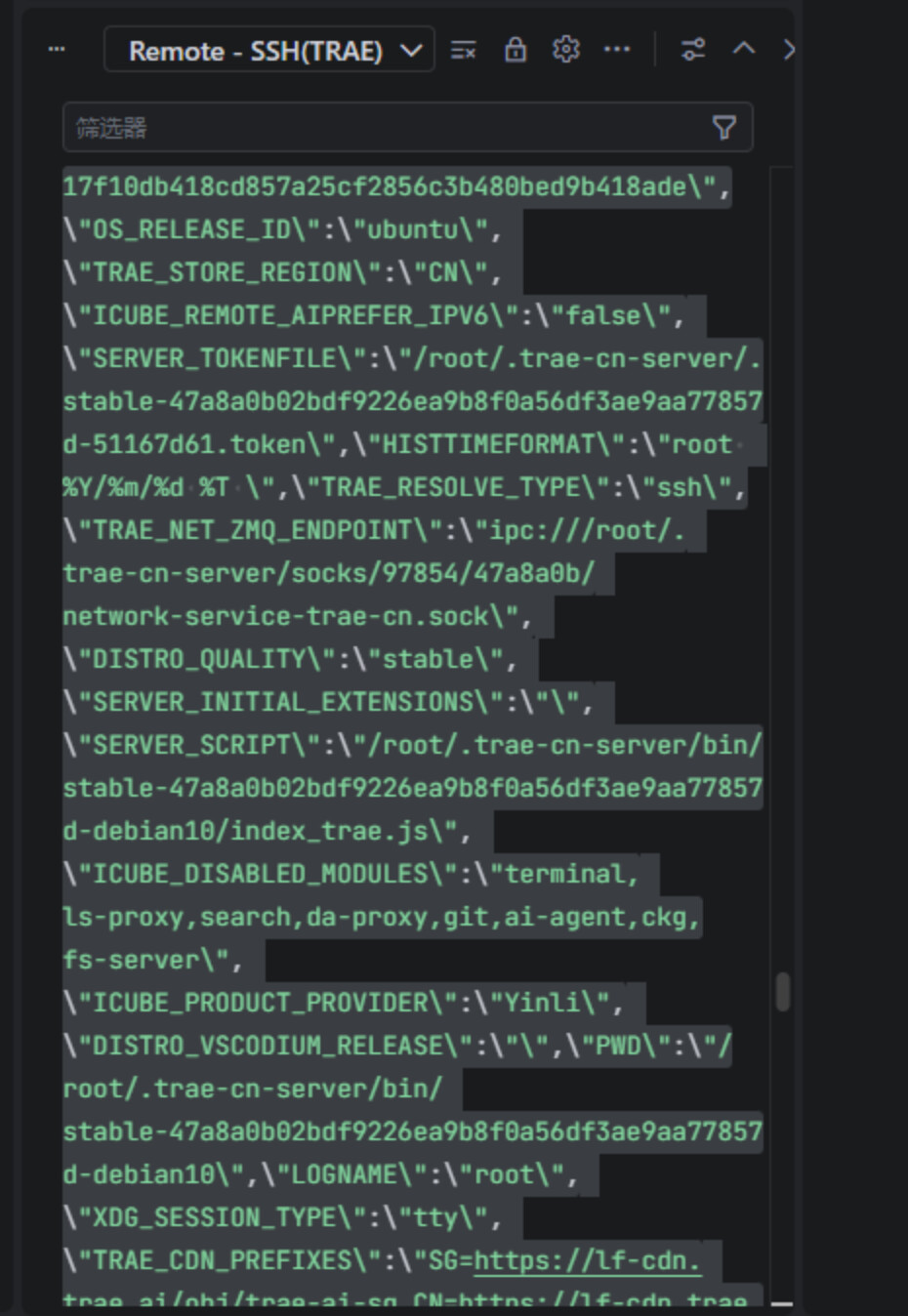 2026-04-08T11:49:38.448+08:00 [info] [1775620176725_846566][SSH] AskPass environment variables set: {“SSH_ASKPASS”:“C:\\Users\\hugui\\AppData\\Local\\Temp\\trae-ssh-askpass-9g6b3zfl\\askpass.cmd”,“SSH_ASKPASS_REQUIRE”:“force”,“DISPLAY”:“0”,“VSCODE_SSH_ASKPASS_NODE”:“C:\\Users\\hugui\\AppData\\Local\\Programs\\Trae CN\\Trae CN.exe”,“VSCODE_SSH_ASKPASS_MAIN”:“c:\\Users\\hugui\\AppData\\Local\\Programs\\Trae CN\\resources\\app\\extensions\\cloudide.icube-remote-ssh\\out\\askpass-main.js”,“VSCODE_SSH_ASKPASS_HANDLE”:“\\\\?\\pipe\\icube-askpass-undefined@120.48.40.247-1775620178408-64bcf166”,“VSCODE_SSH_ASKPASS_EXTRA_ARGS”:“”}