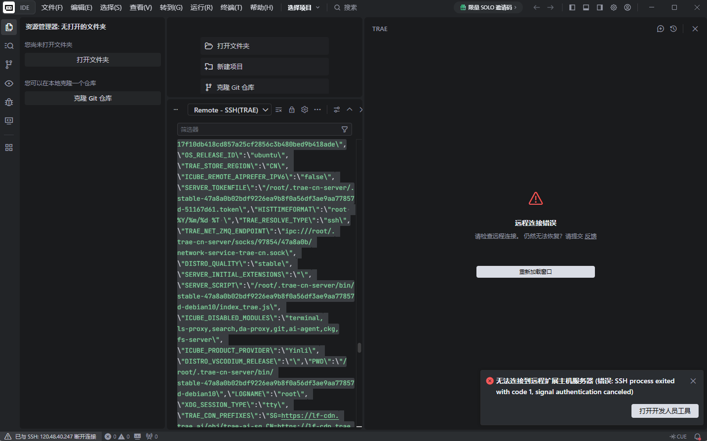 2026-04-08T11:49:38.449+08:00 [info] [1775620176725_846566][SSH] Local server process started with PID: 9076, server details: {“serverId":"undefined@ 120.48.40.247”,“sshCommand”:“C:\\WINDOWS\\System32\\OpenSSH\\ssh.exe”,“sshArgs”:[“-v”,“-T”,“-D”,“63805”,“-o”,“StrictHostKeyChecking=no”,“-o”,“UserKnownHostsFile=/dev/null”,“-o”,“ServerAliveInterval=10”,“-o”,“ServerAliveCountMax=3”,“-o”,“RemoteCommand=bash -l -c \“exec bash --login\””,“120.48.40.247”],“ipcHandlePath”:“\\\\?\\pipe\\icube-ssh-undefined@120.48.40.247-1775620178407-48fe93df”,“serverDataFolderName”:“.trae-cn-server”,“dataFilePath”:“C:\\Users\\hugui\\AppData\\Local\\Temp\\vscode-ssh-undefined@120.48.40.247-27416-szi3j2l4.json”}