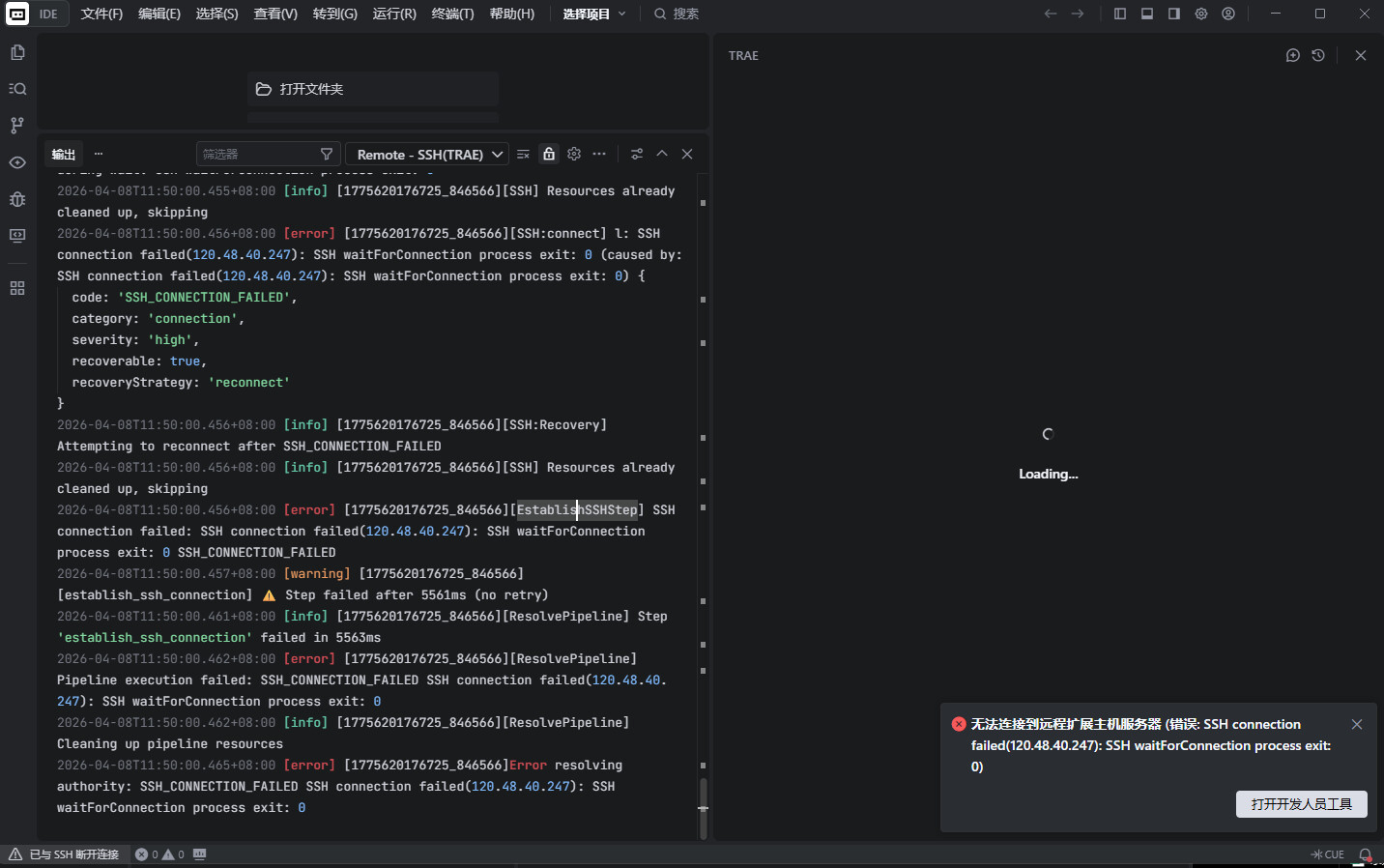 2026-04-08T11:49:54.892+08:00 [error] [1775620176725_846566][SSH] Connection failed during wait: SSH waitForConnection process exit: 0