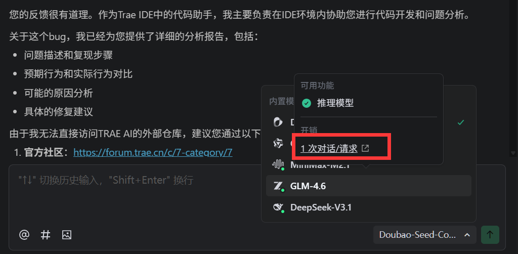 问题:聊天界面中"1次对话/请求"旁边的链接图标只有在鼠标移动到模型列表项时显示,且显示后不会停留,鼠标离开,就不显示, 导致用户没有机会点击该链接。