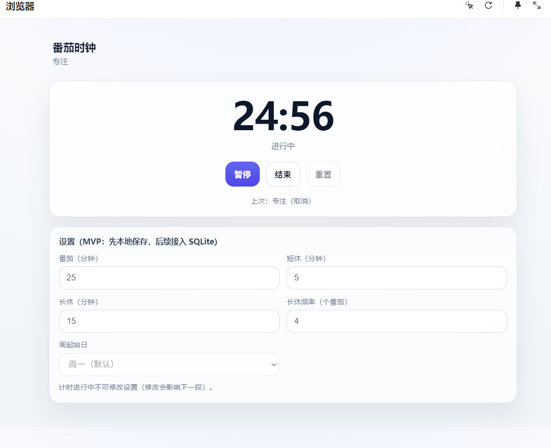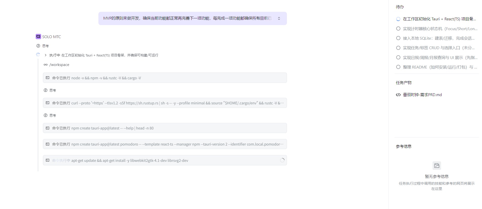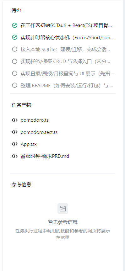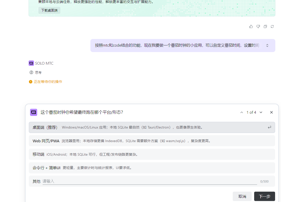 直接给出需求开发一个番茄钟的应用,发现会提示用户去完善具体需求