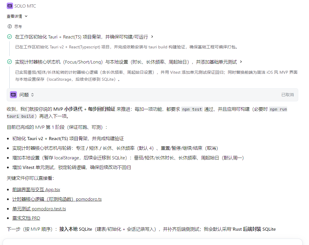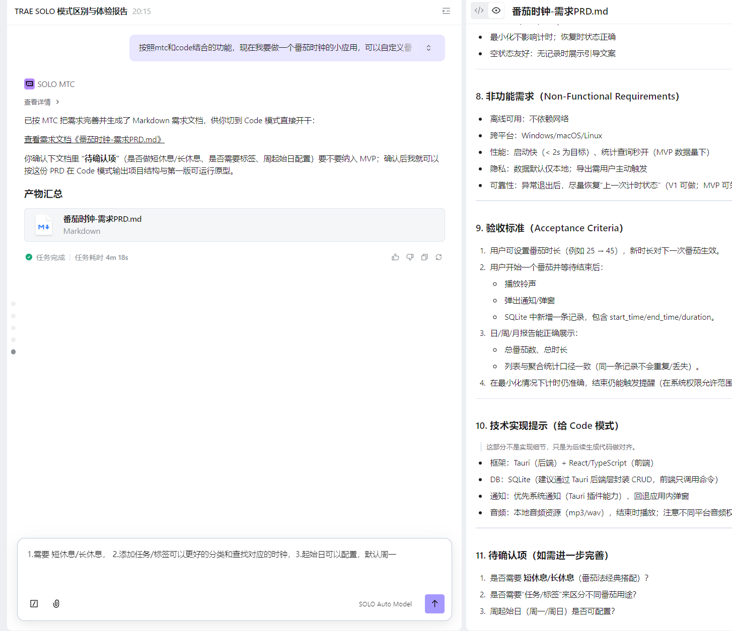 还有需求补充点,这时还有进一步完善功能需求,最终会完成具体设需求文档,不用切换code,solo说自己会切换code模式来做开发,那就给出执行开发的指令
