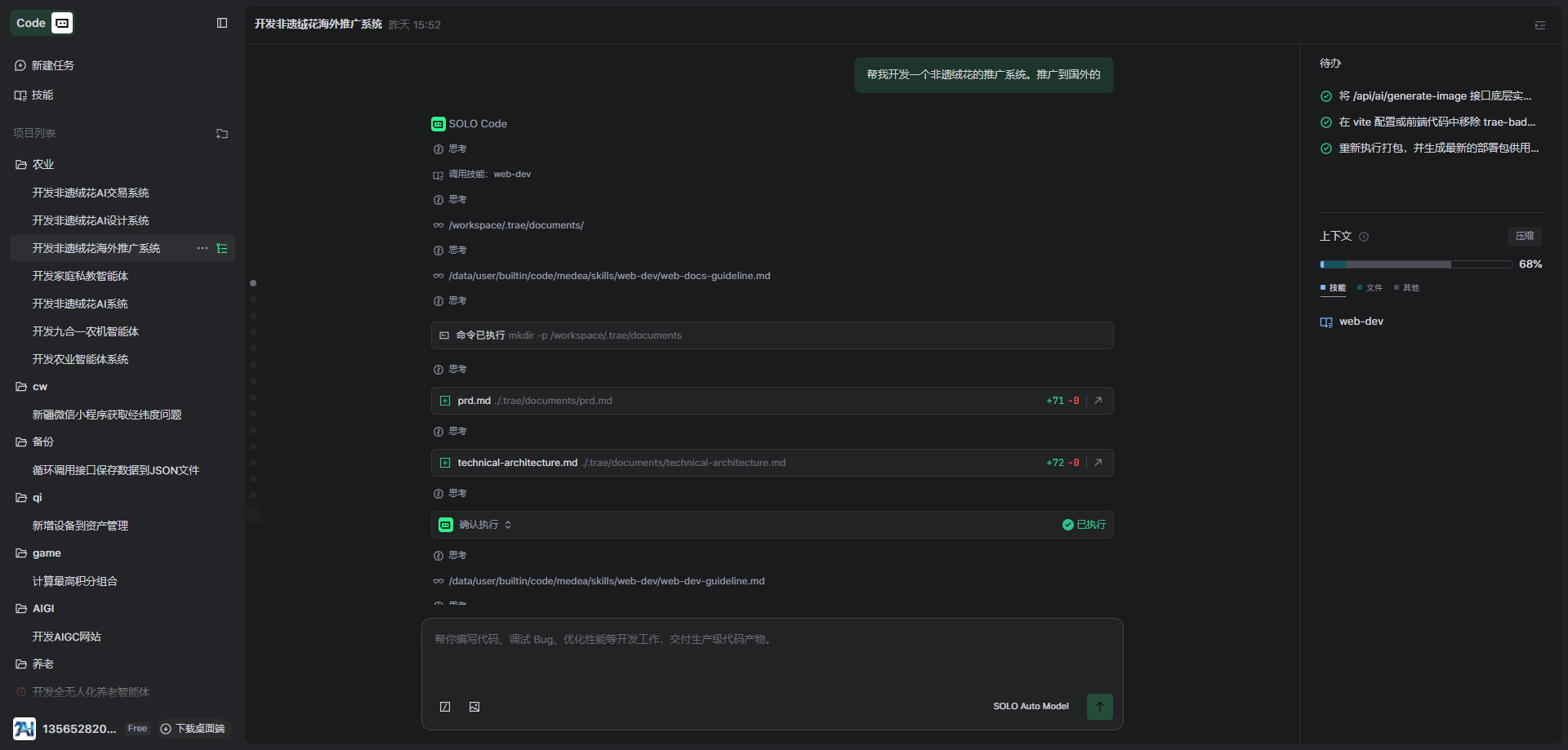 Code模式(极客首选): 这是为开发者量身定制的。它不仅仅是生成代码片段,而是具备“全链路”开发能力。在实测中,我让它基于《三体》的“群星计划”概念搭建一个营销网站。SOLO展现了惊人的自主性:它自主拆解任务、选择技术栈、编写代码、甚至在遇到报错时自主调试。它像一个真正的工程师一样,理解了项目结构,并在正确的位置提交了代码。对于专业开发者,它支持随时中断AI的工作进行手动微调,这种“可控的自动化”非常关键。