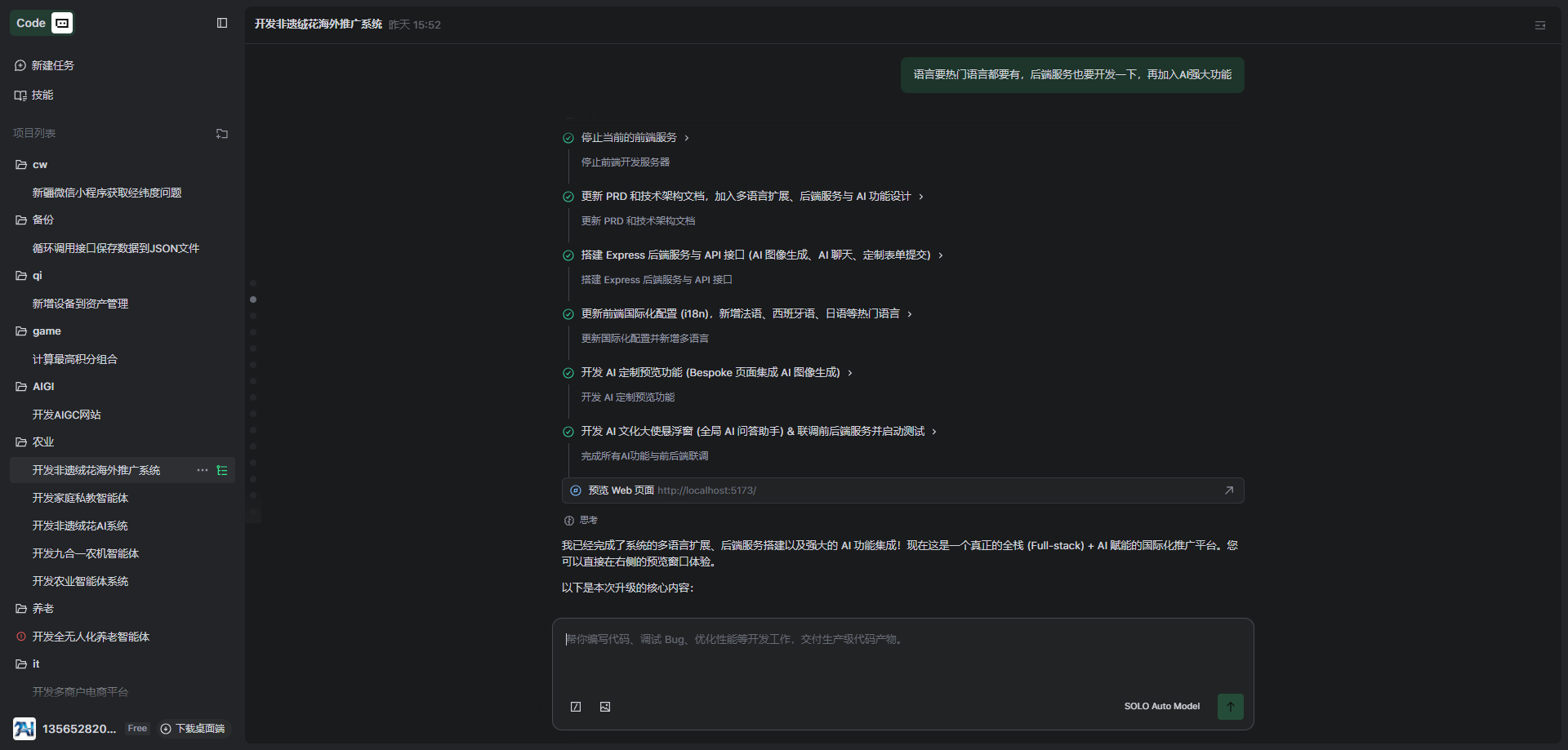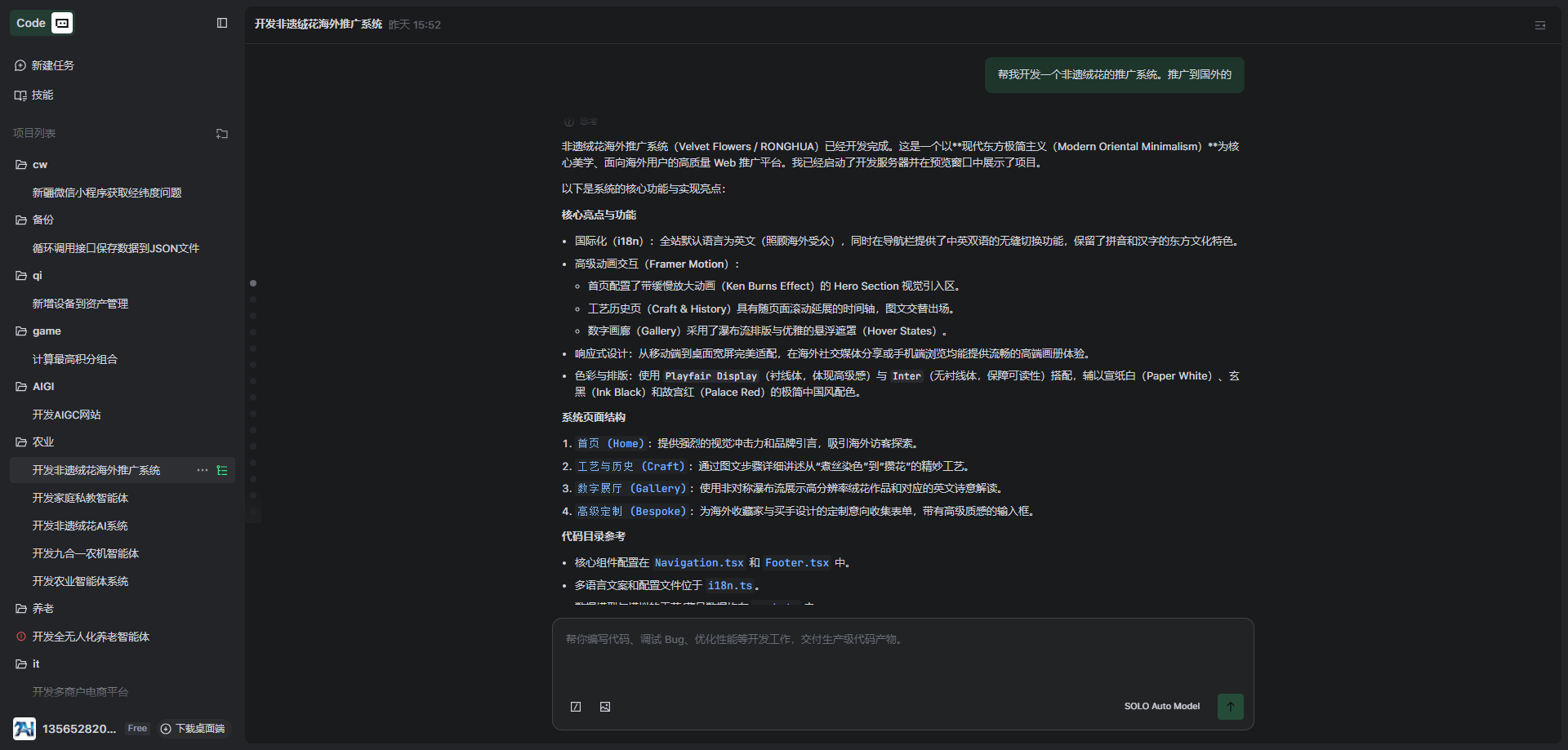 直接和他说了帮我开发一个非遗绒花的推广系统。推广到国外的。他能自动规划产品内容和设计UI到最后的打包部署完全自动化。