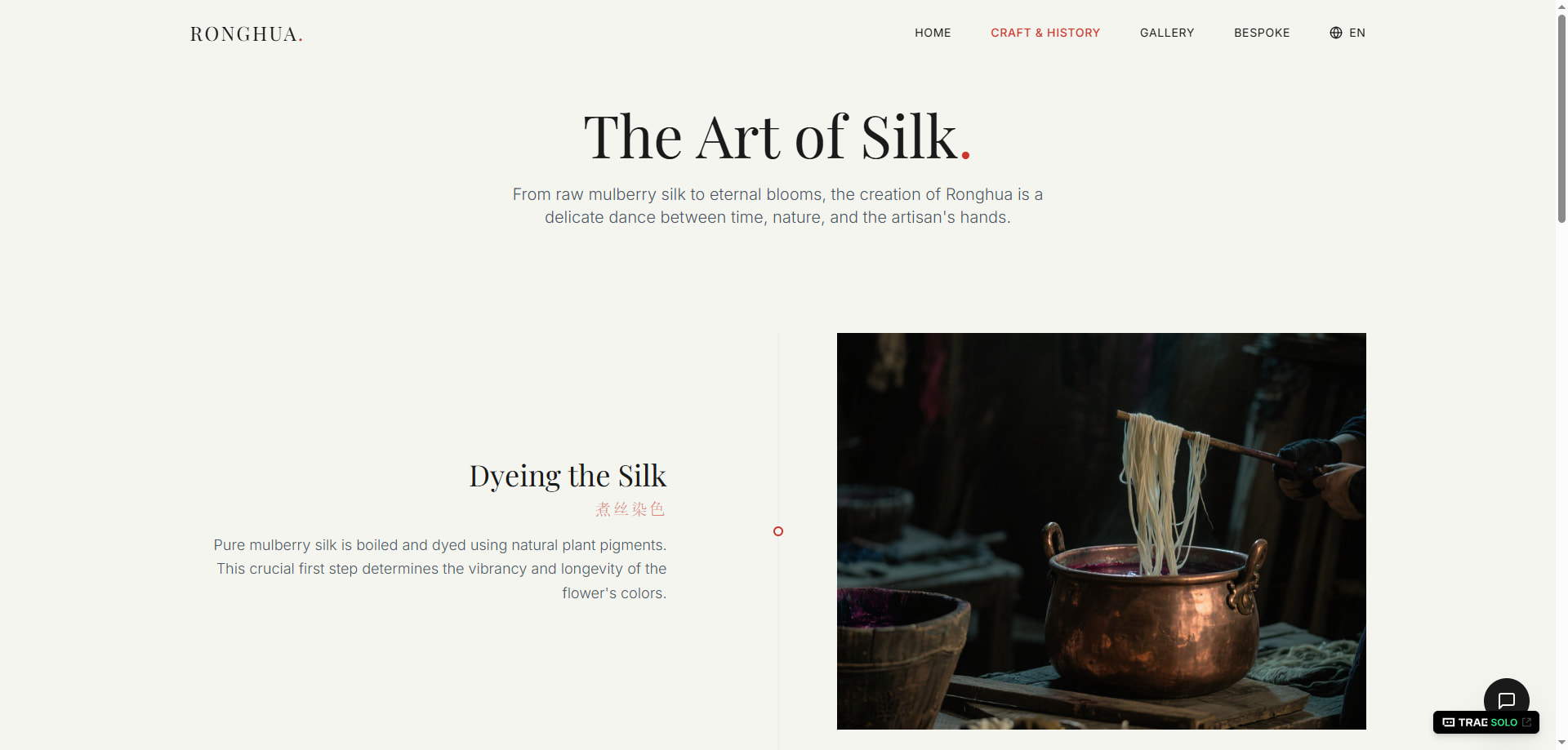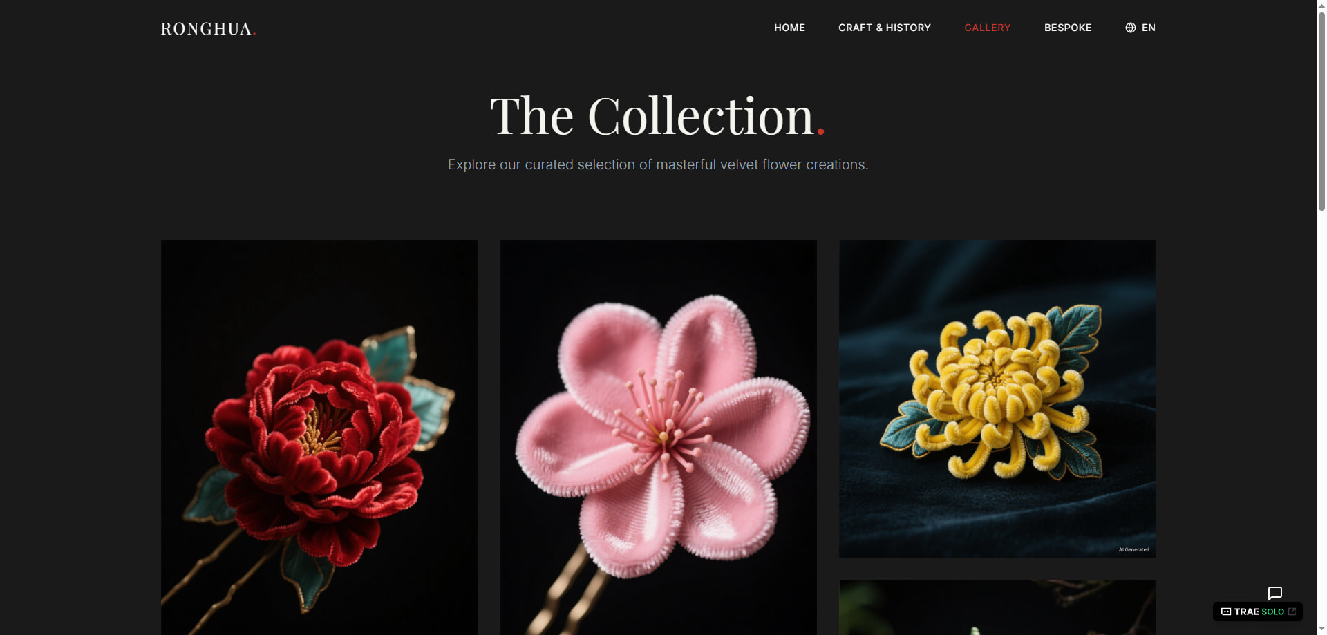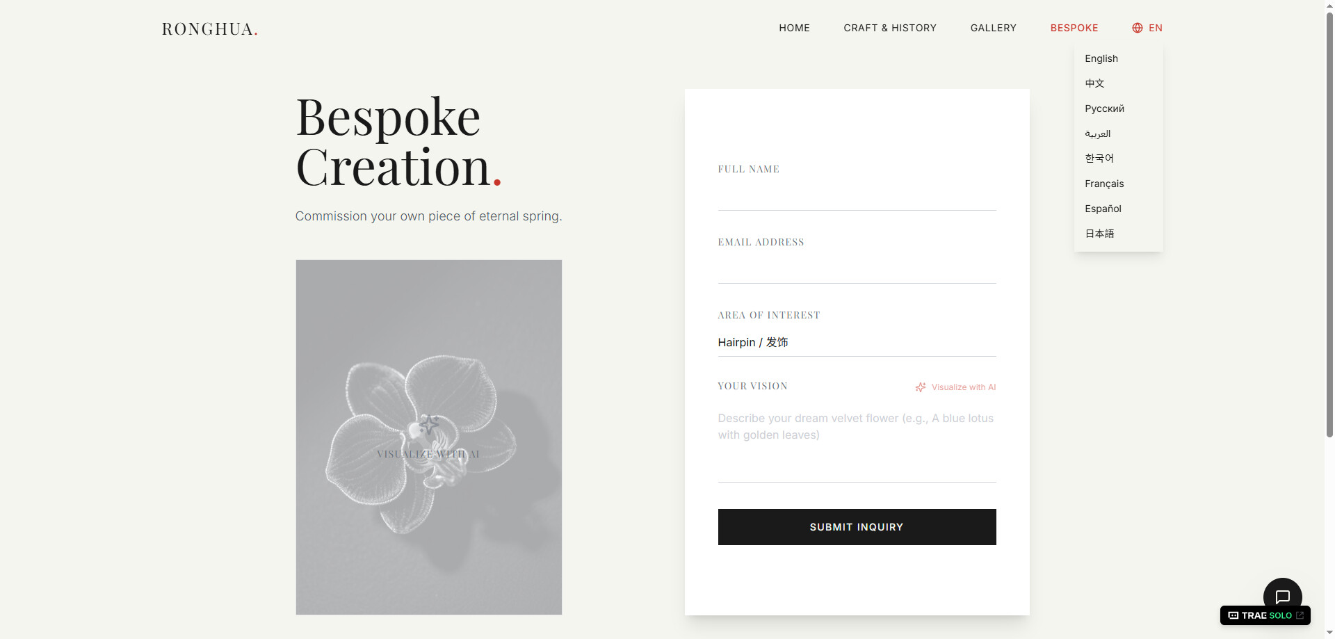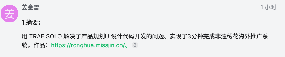 用 TRAE SOLO 解决了产品规划UI设计代码开发的问题、实现了3分钟完成非遗绒花海外推广系统,作品:https://ronghua.missjin.cn/。