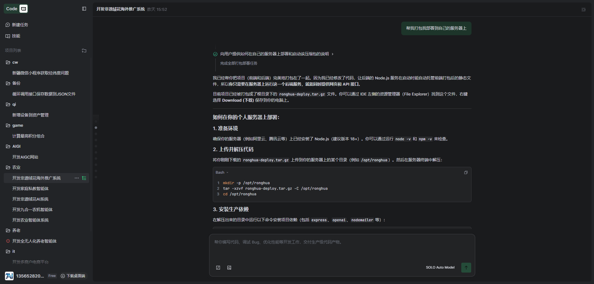 SOLO 在流程中做了所有的产品定义和内容包括所有图片的生成到最后的打包部署,真正让我实现了一人公司;