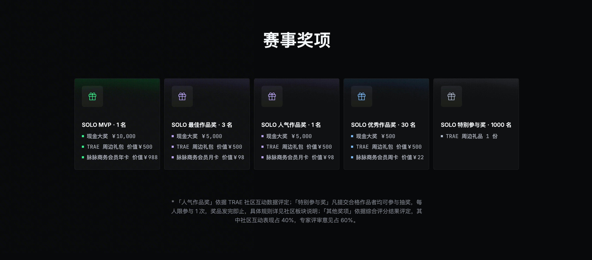 SOLO 人气作品奖(1名):人气作品奖(1名)现金大奖 ¥5,000 、TRAE 周边礼包(价值¥500)、脉脉商务会员卡月卡(价值¥98)。由 TRAE 社区(forum.trae.cn)用户的点赞、评论、投票等综合互动数据决定。