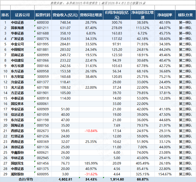• 29 家券商的营收、净利润、同比增速、净利润率、梯队分类