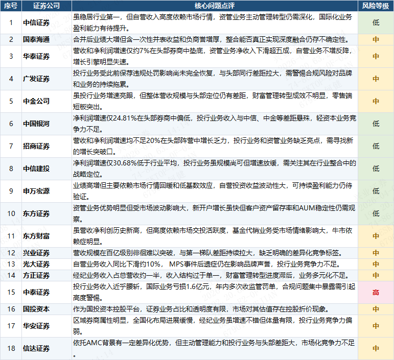• 对每家券商形成个性化点评,指出其核心问题与风险