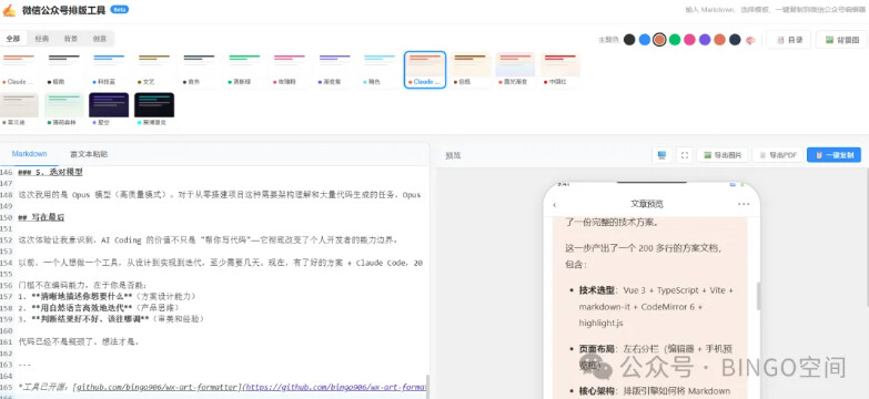 不是 demo,不是半成品。是 17 套模板、Markdown 实时预览、代码高亮、一键复制粘贴到微信编辑器就能用的那种。