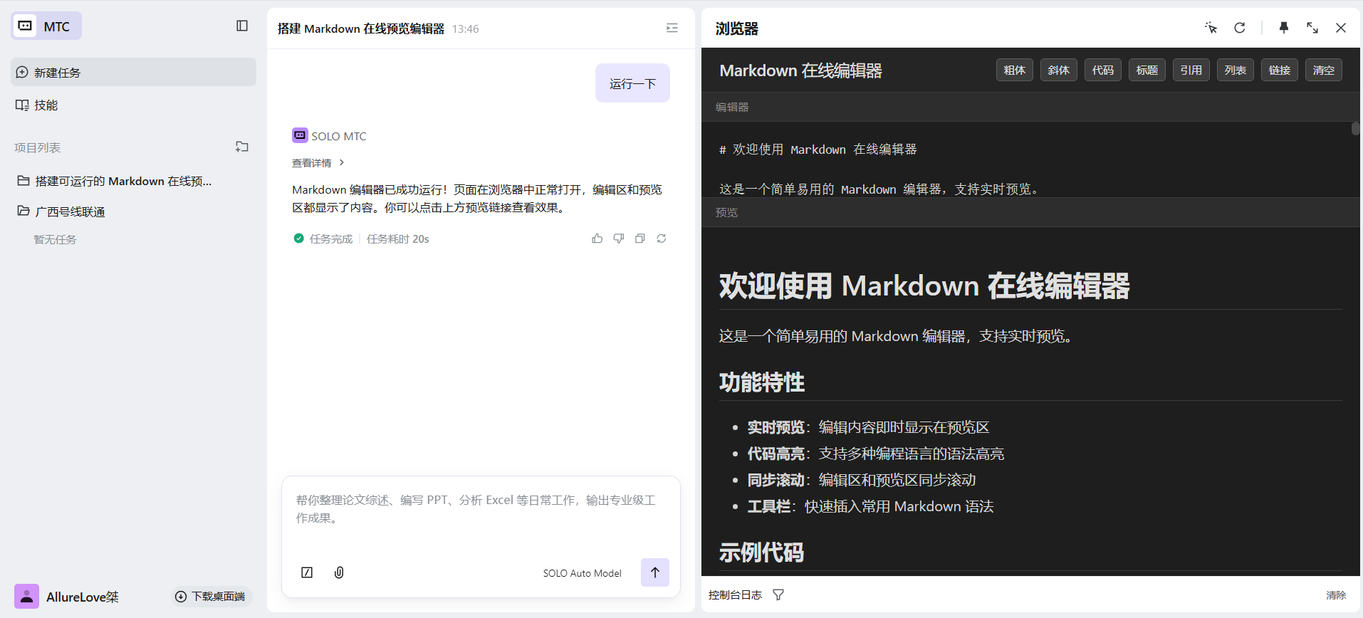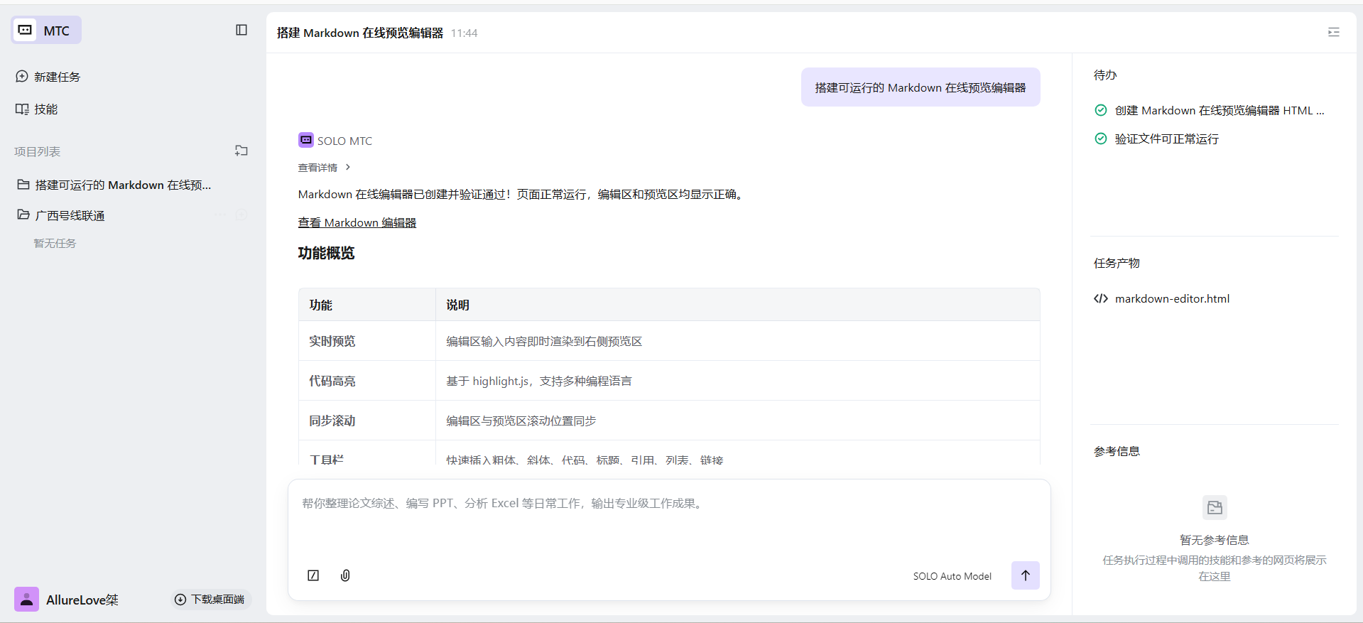 用 TRAE SOLO 快速开发了一个纯前端、可直接本地运行的 Markdown 在线预览编辑器,实现左侧编辑、右侧实时渲染、一键复制 HTML 与导出文件功能,零配置开箱即用,完整复现主流 Markdown 编辑器核心体验。