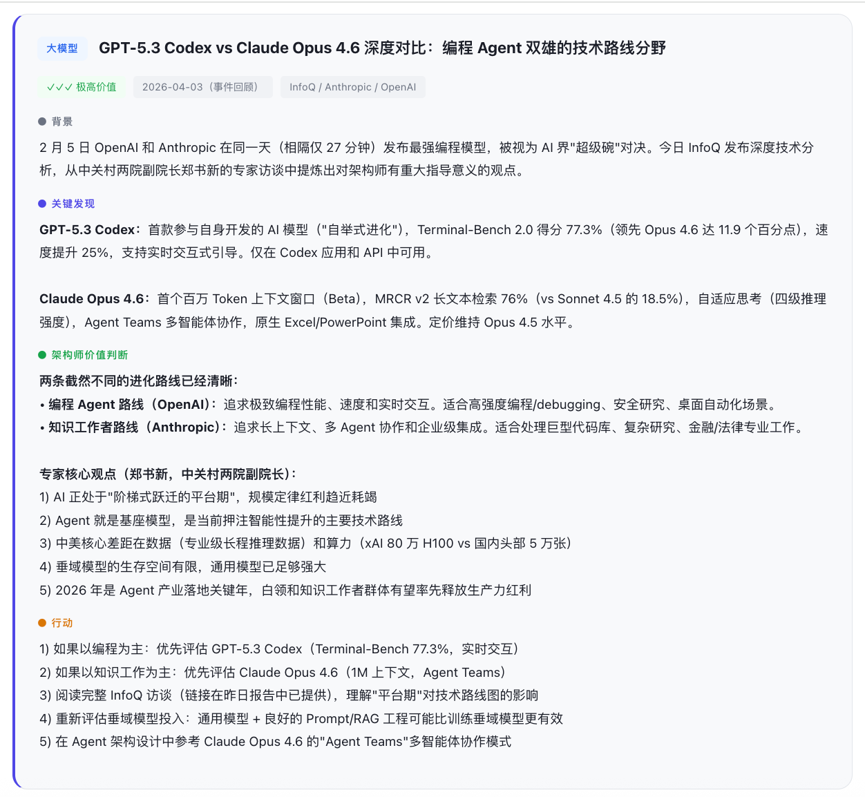 累计追踪 25+ 条关键动态,覆盖 2026 年 3 月 17 日至 4 月 7 日。每条动态包含背景、事件、价值评估、行动建议四个维度,技术概念用产品经理能理解的语言解释。